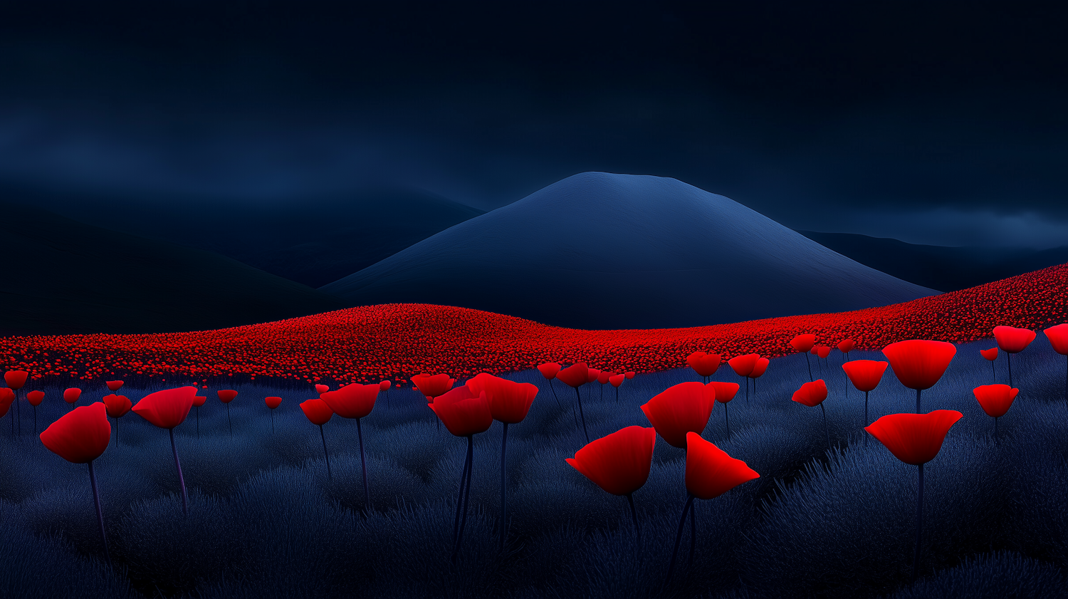 Surreal landscape with vibrant red poppies against deep blue grass under a moody sky, creating a striking visual contrast.