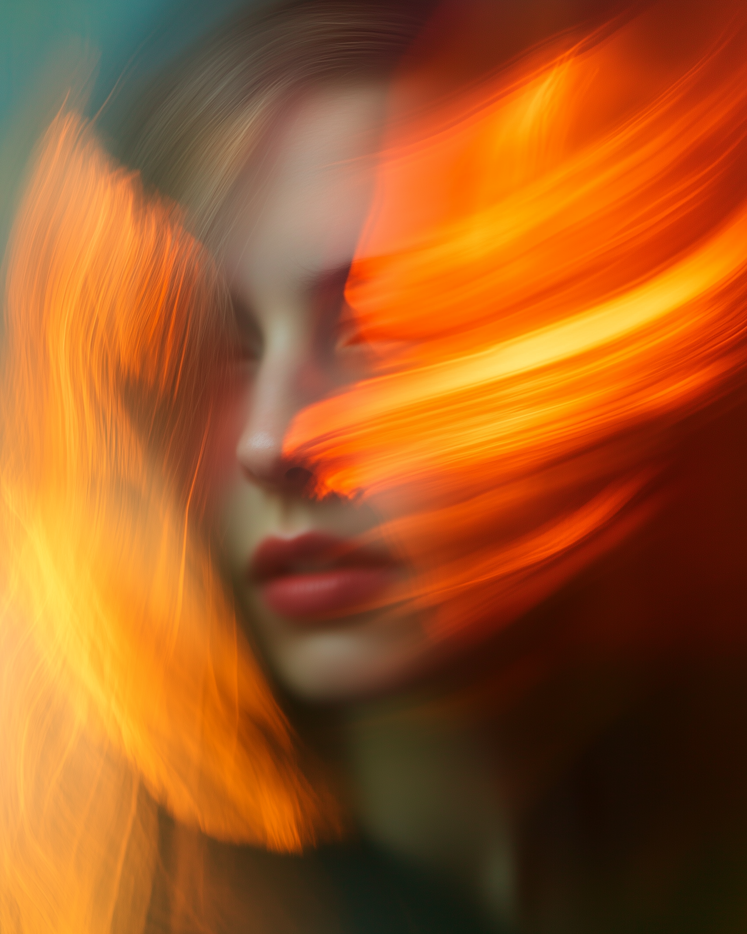 Abstract image with vibrant orange light streaks obscuring a partially visible face, creating a dynamic and surreal effect.