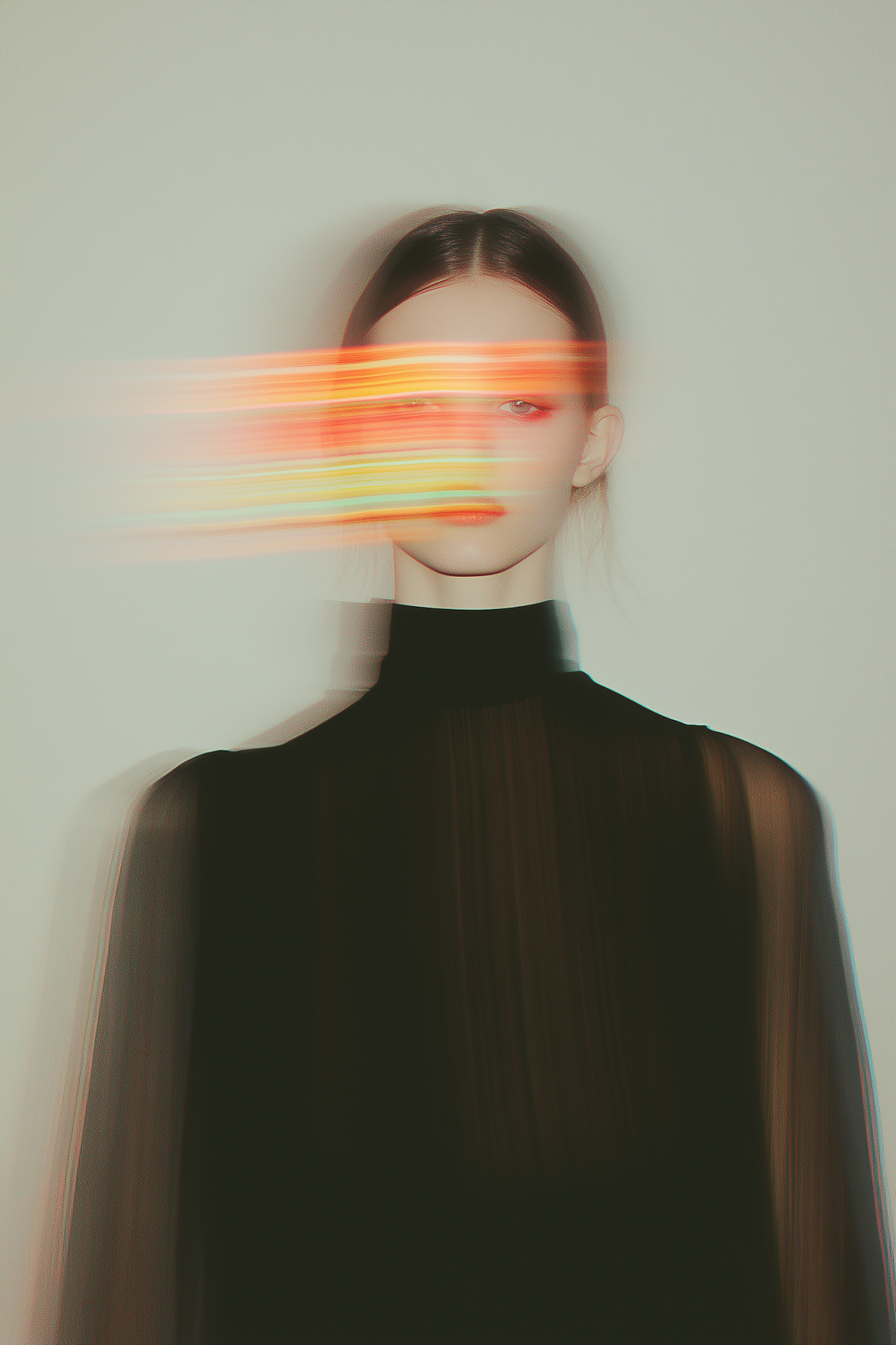 A surreal portrait of a woman in a black top with a streak of vibrant light obscuring her face, blending fashion and digital art.