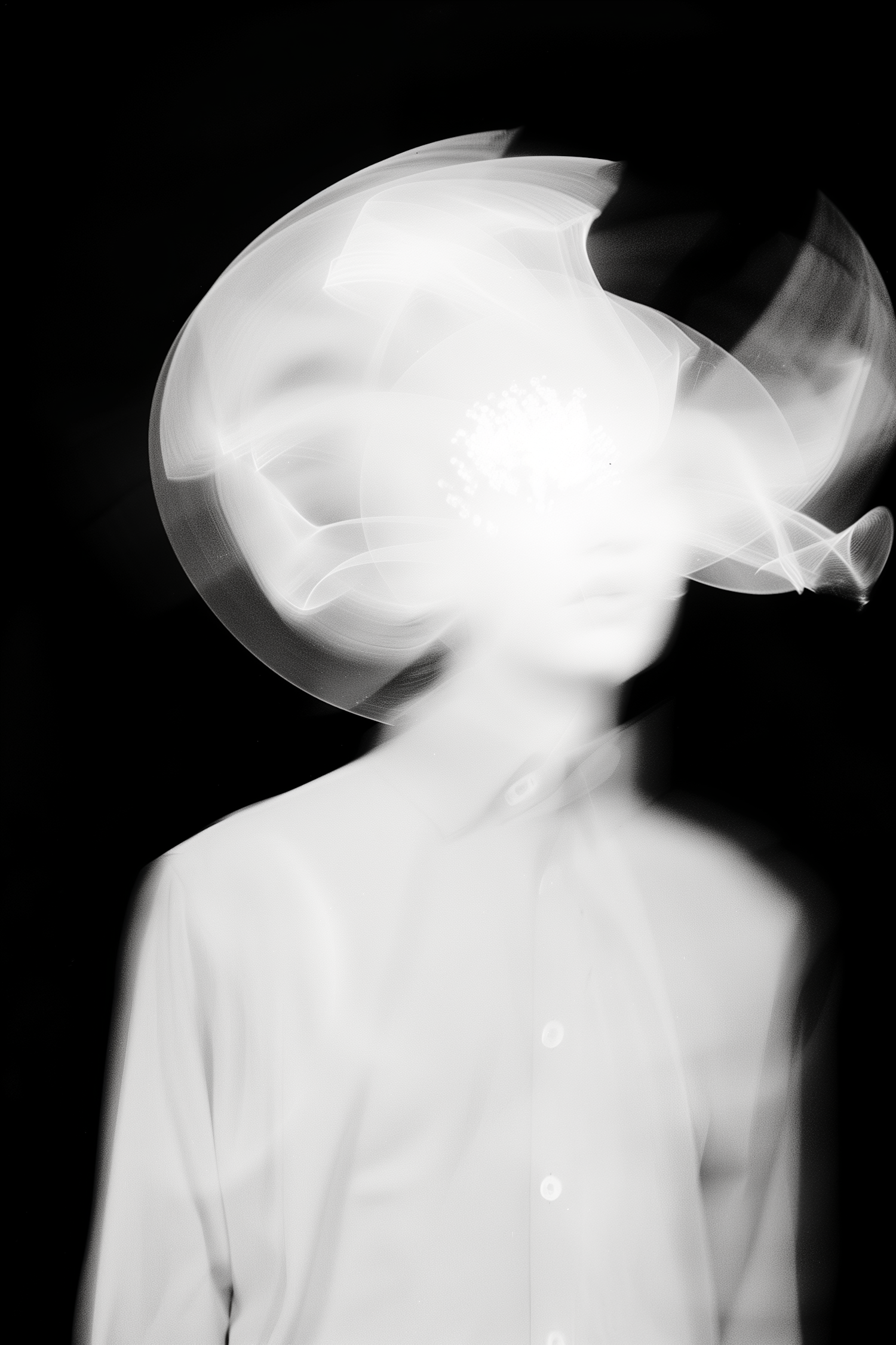 Surreal black-and-white image of a blurred figure with glowing abstract light patterns obscuring the face, set against a dark background.