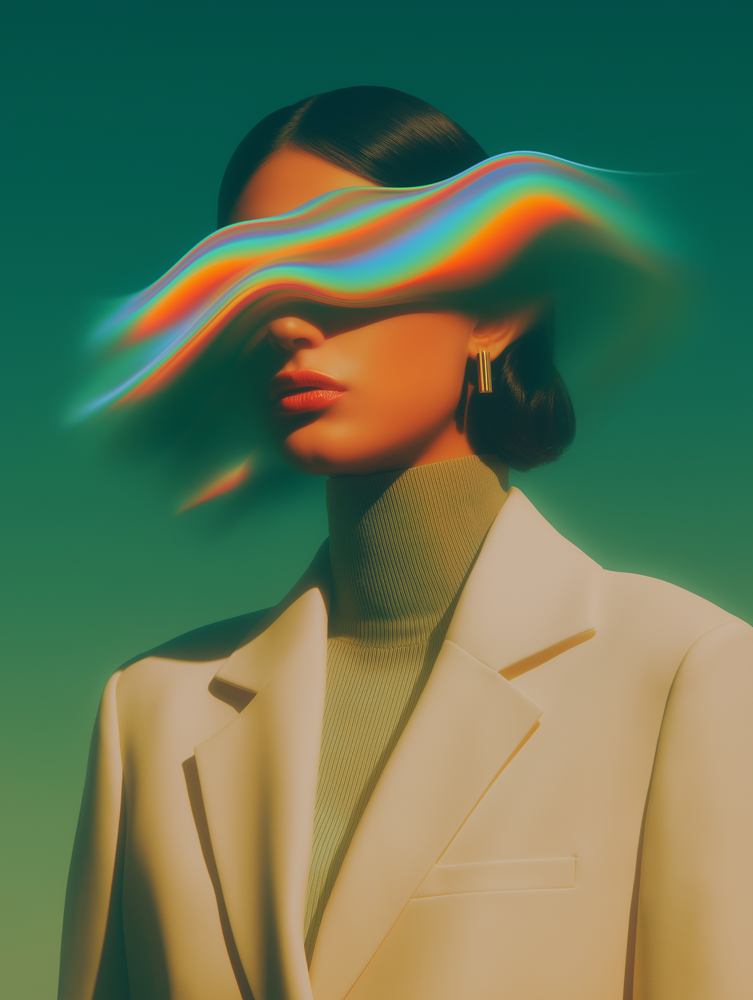 A surreal portrait of a person with a colorful light wave obscuring their eyes, set against a green gradient background.