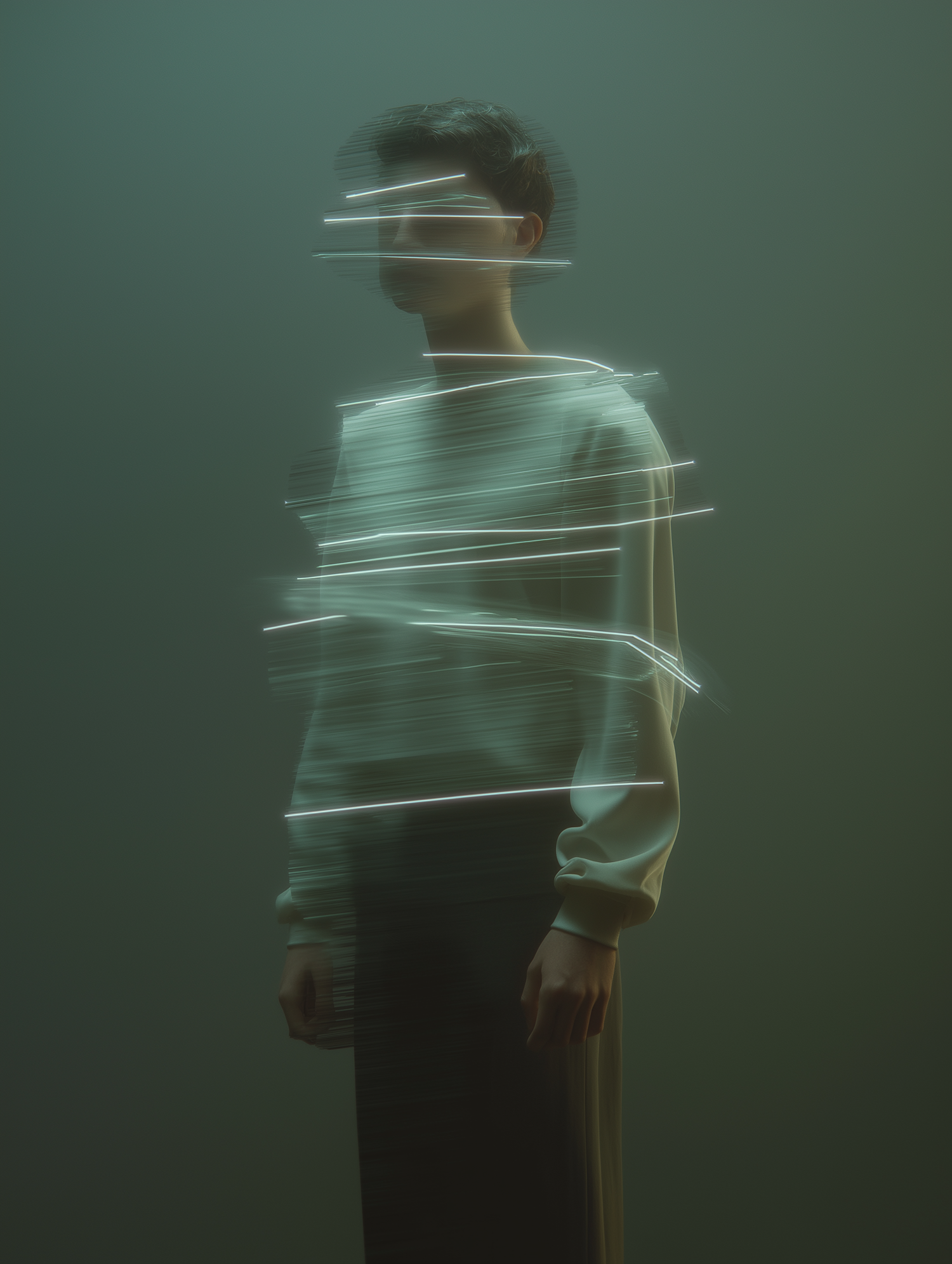 A surreal portrait of a person with light streaks creating a futuristic, motion-like effect in a greenish, minimalistic setting.