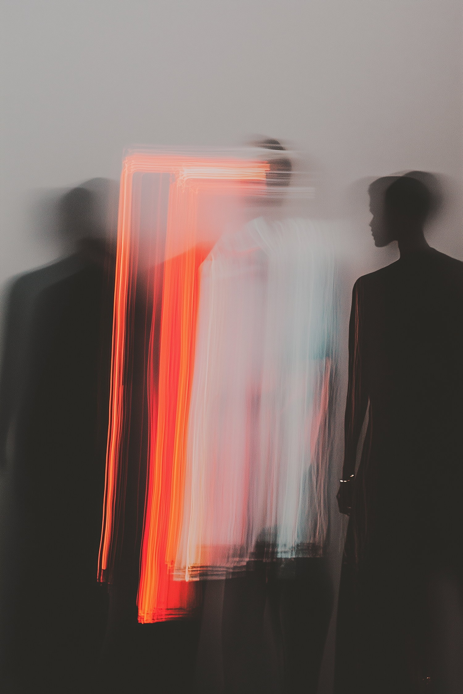 Abstract image with blurred silhouettes and vibrant red light trails, creating a surreal and dynamic visual effect.