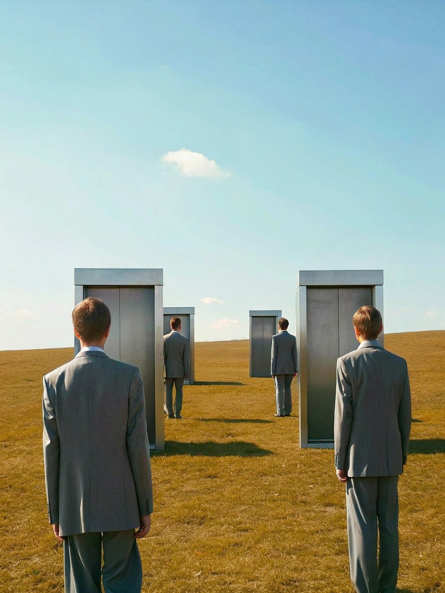 A surreal image of identical men in suits facing metallic doorframes in a grassy field under a clear blue sky.