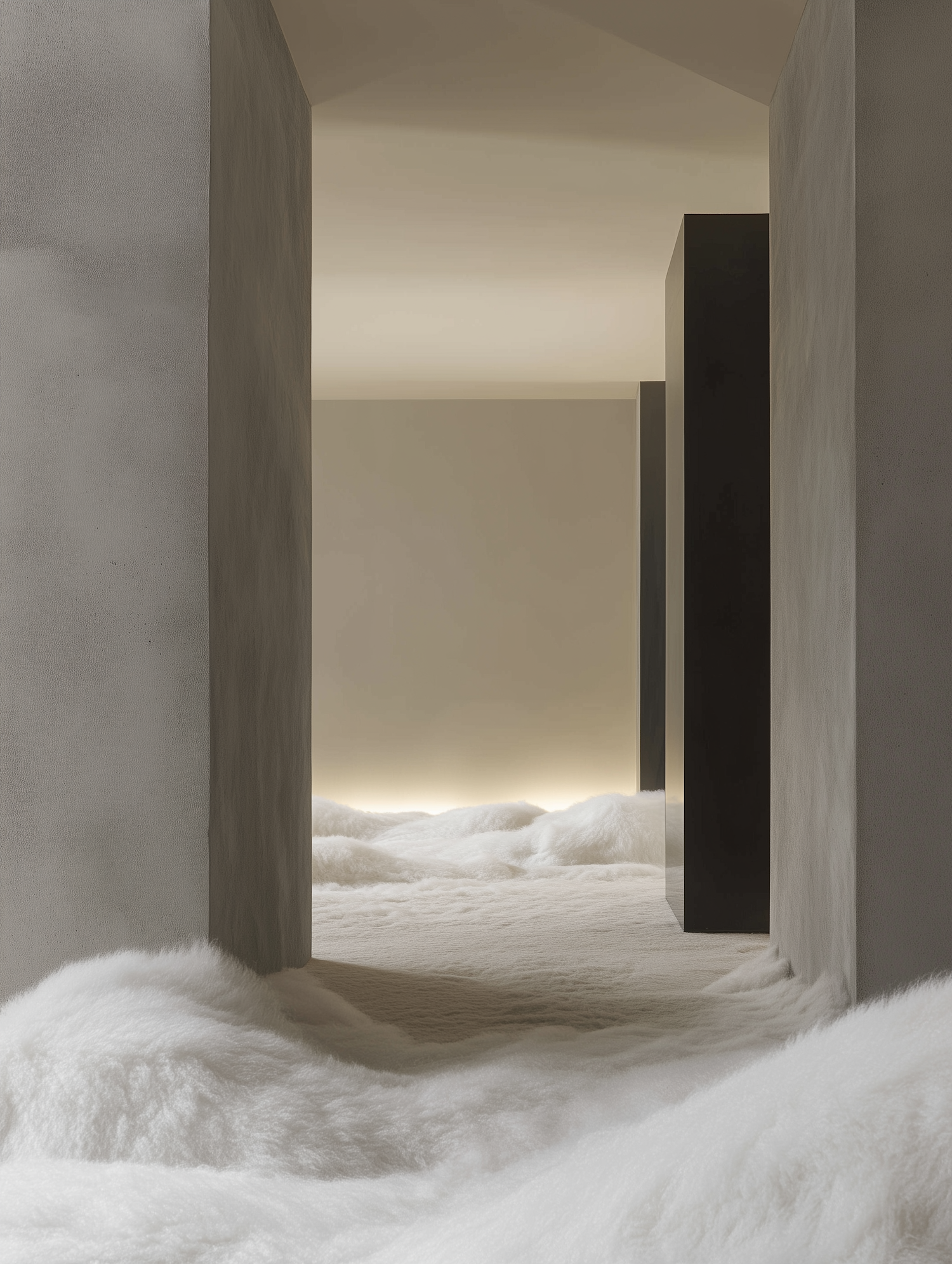 A surreal minimalist interior with soft lighting, fluffy white flooring, and contrasting dark columns for a dreamlike architectural vibe.