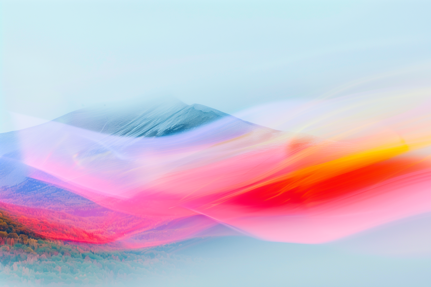 A dreamy mountain scene with vibrant streaks of pink, red, and yellow blending over a snow-capped peak and autumnal forest.