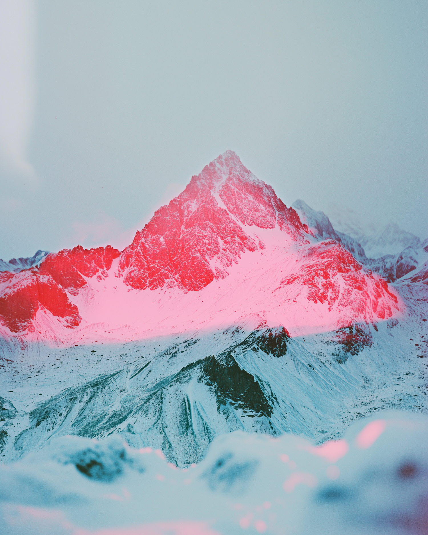 Surreal snowy mountain landscape with vivid red and blue hues, blending natural beauty with an artistic, dreamlike atmosphere.