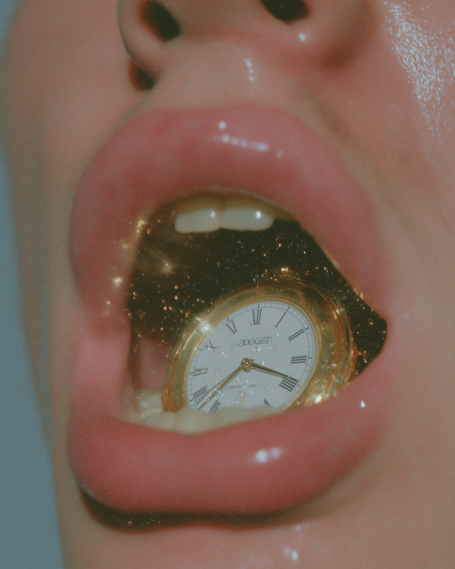 Close-up of a glossy mouth holding a gold pocket watch, creating a surreal and artistic visual with a dreamy, sparkling overlay.