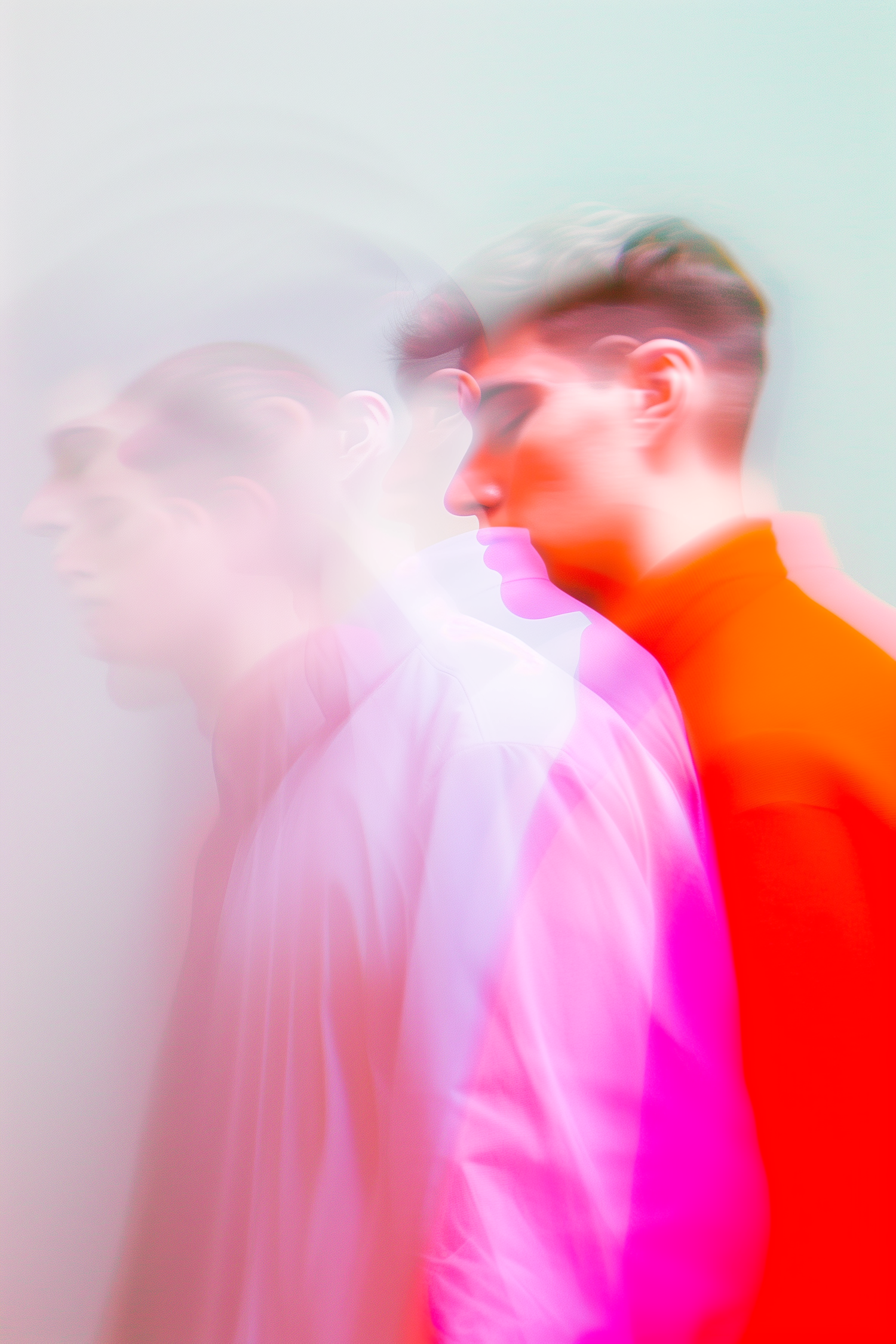 A vibrant, multi-exposure portrait of a young man in pink and red tones, creating a surreal and dynamic visual effect.