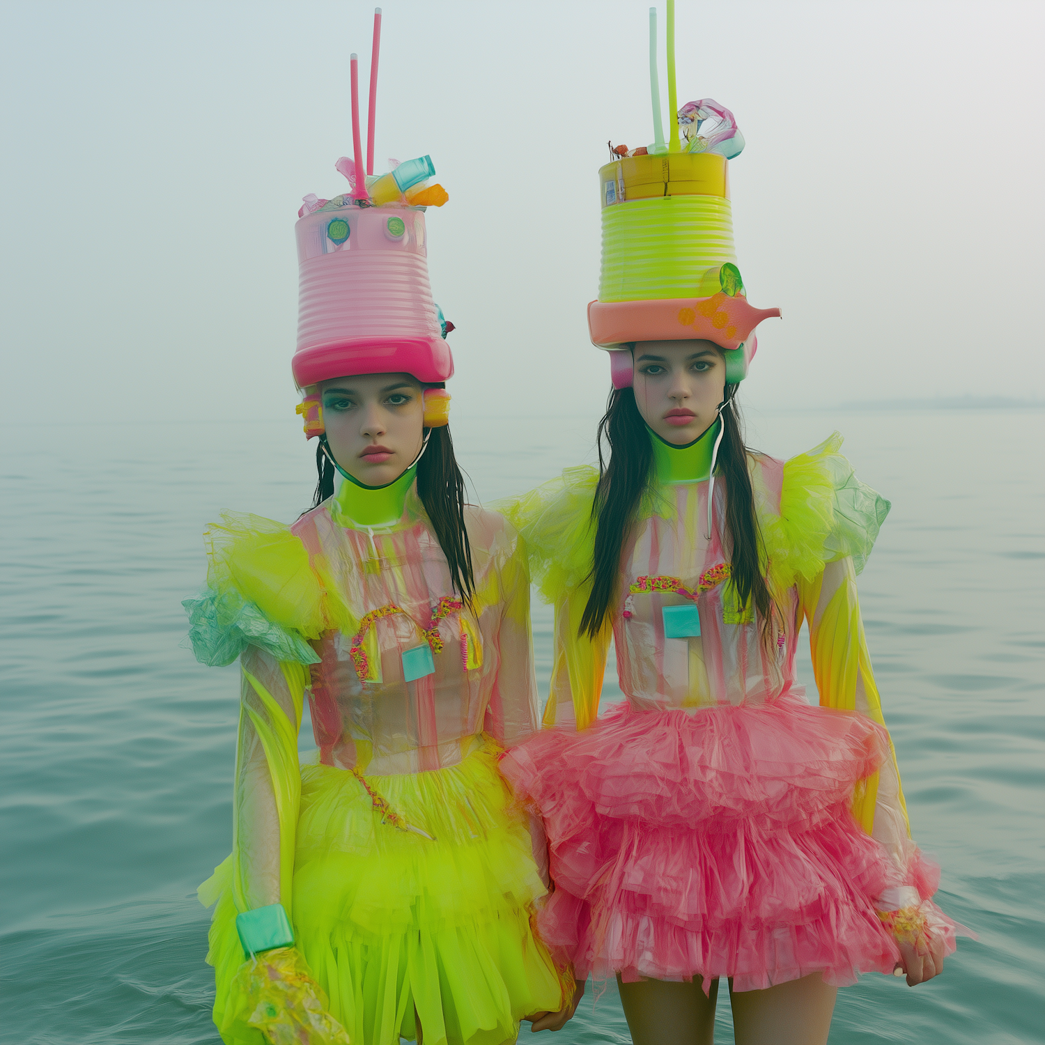 Two women in neon, avant-garde outfits with unique headpieces stand by a misty sea, creating a surreal and futuristic scene.