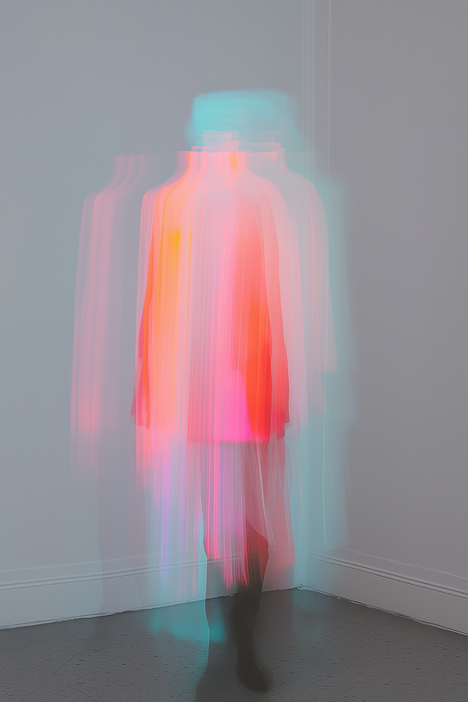 A surreal, motion-blurred figure with neon pink, orange, and cyan streaks in a minimalistic gray room. Abstract and dreamlike vibes.