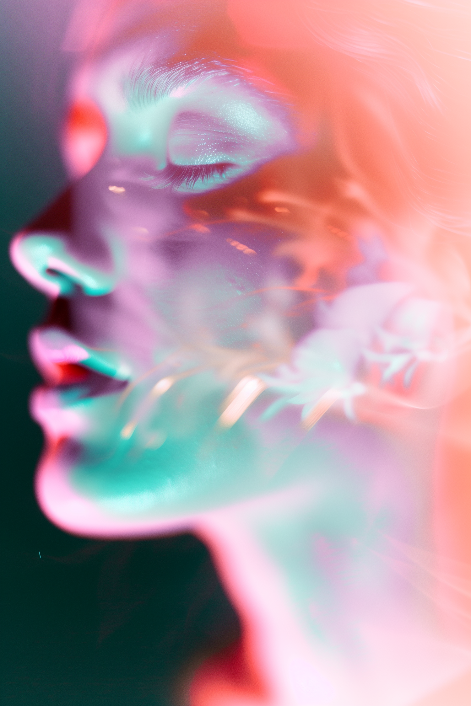 A dreamy, neon-lit close-up of a face with closed eyes, blending vibrant pink, teal, and orange hues with abstract floral overlays.