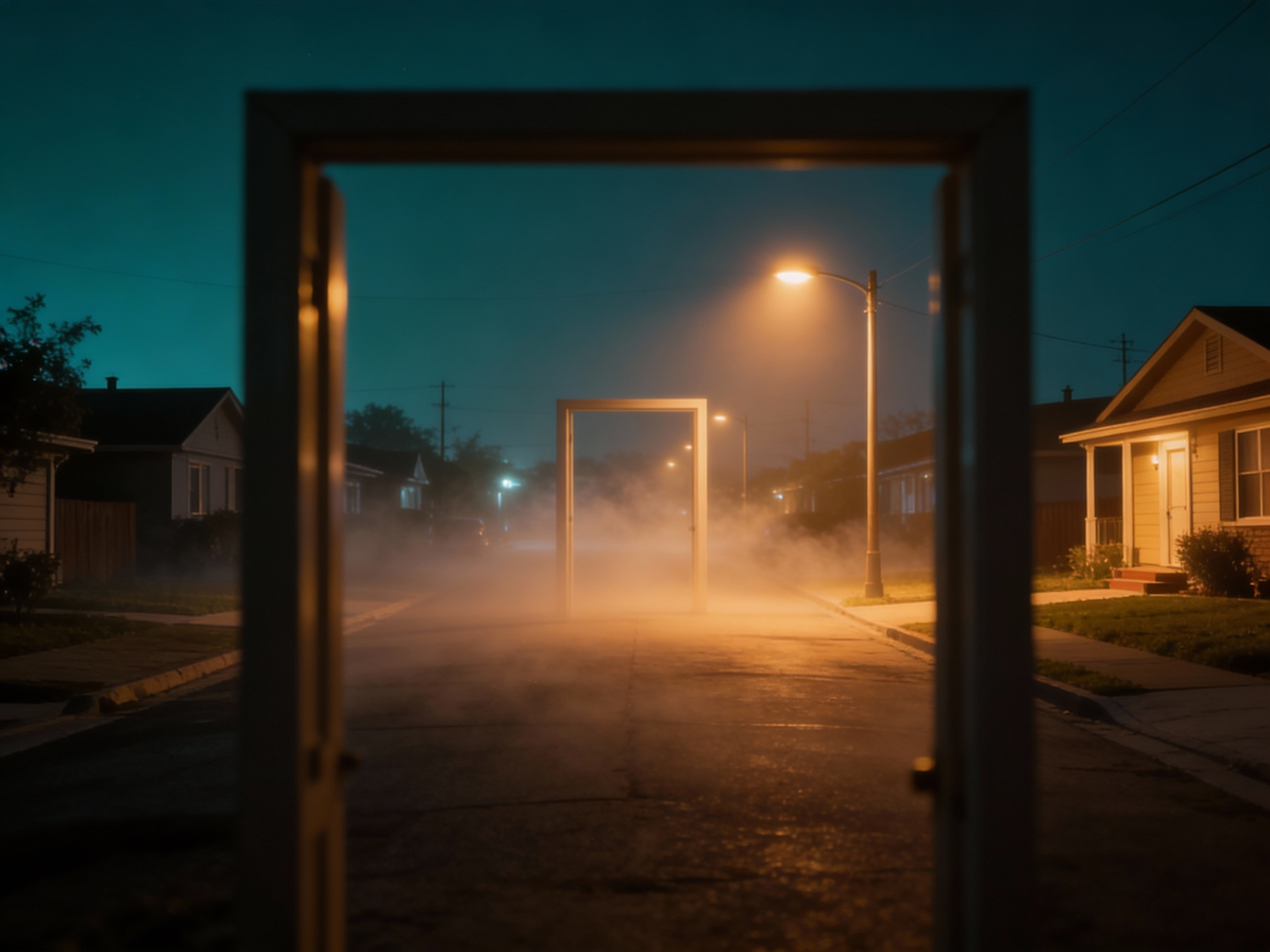 A surreal suburban street at night with glowing door frames and mist, creating a mysterious and dreamlike atmosphere.