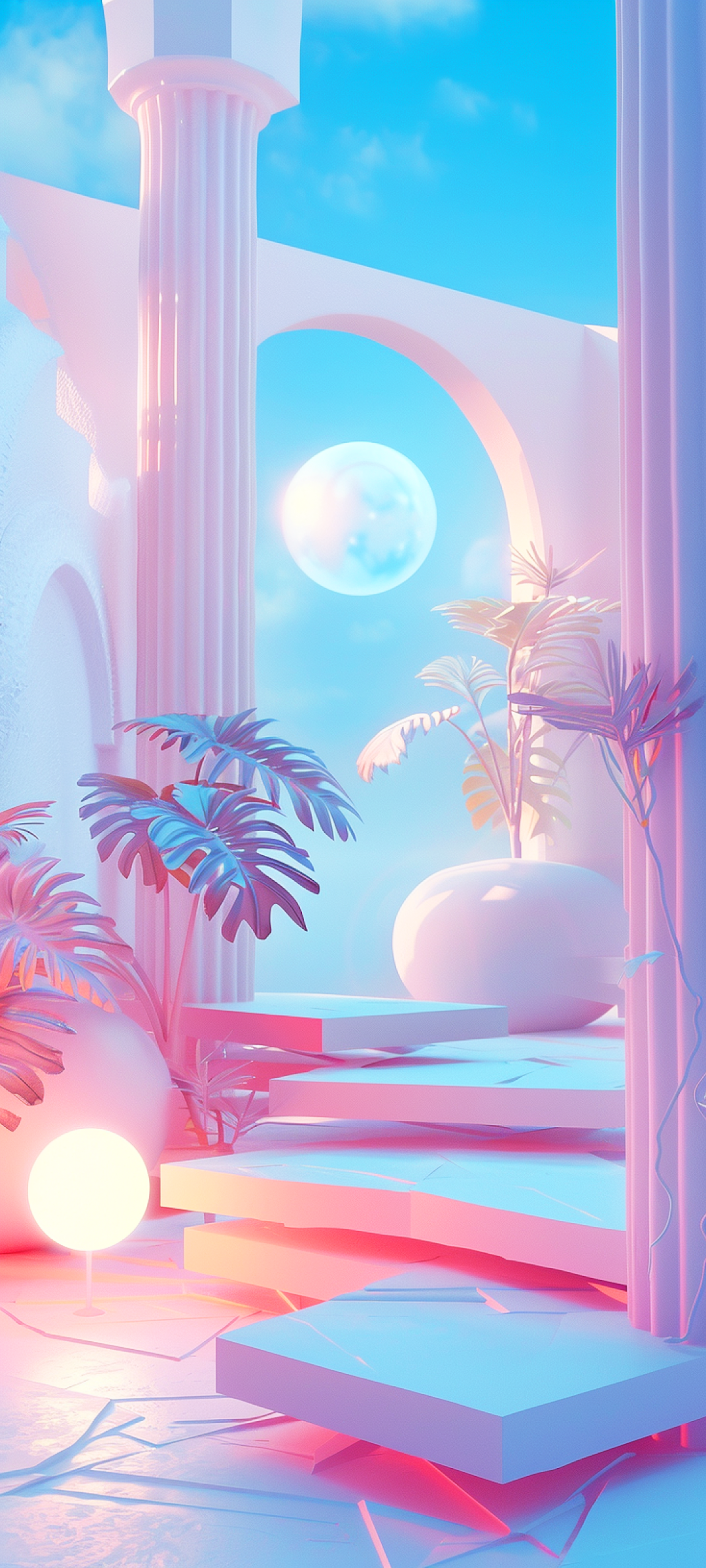 Surreal pastel scene with classical columns, lush plants, and a glowing moon, creating a dreamlike and tranquil atmosphere.