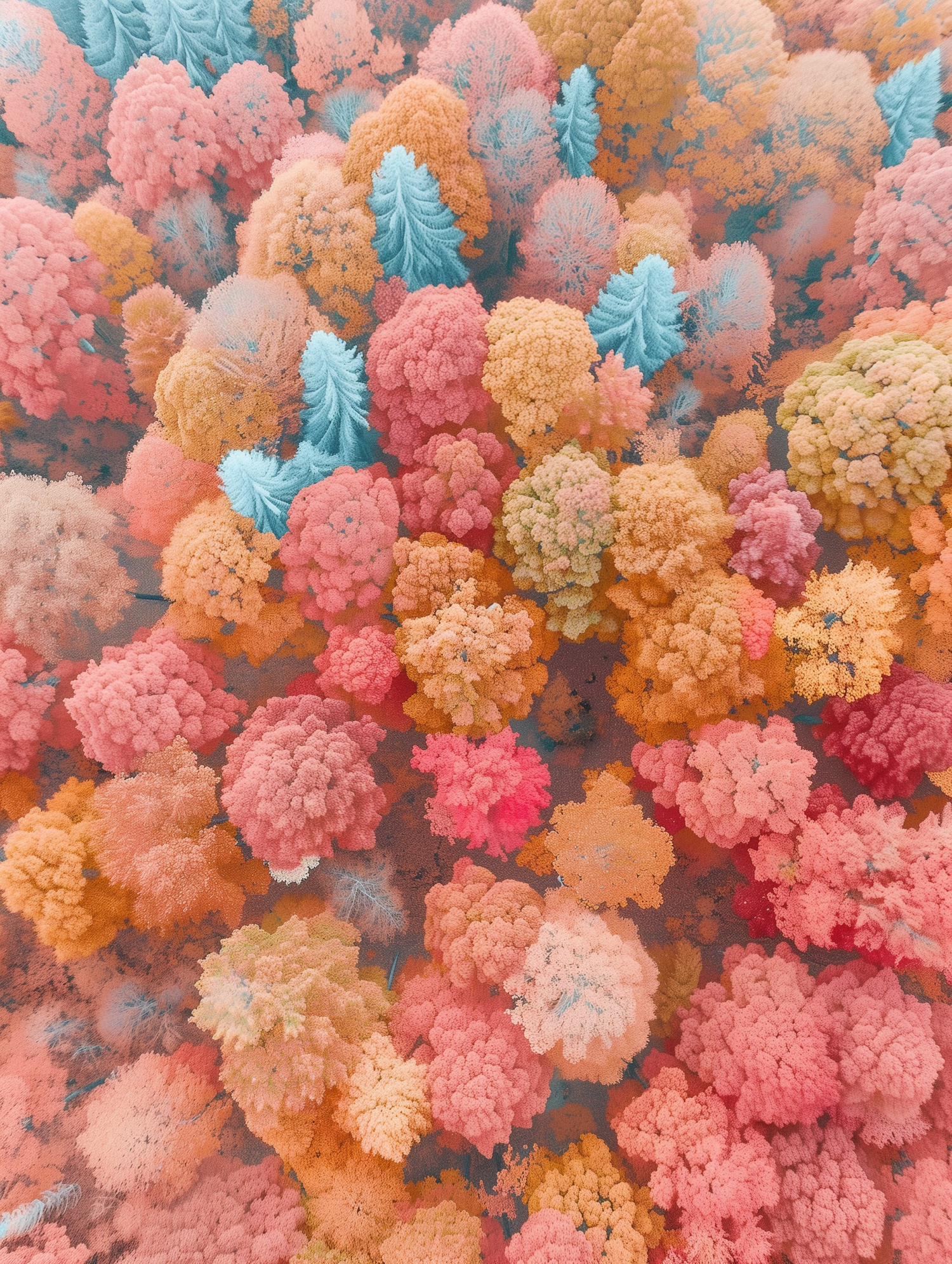 A surreal aerial view of a pastel-colored forest with fluffy, cotton candy-like trees in pink, orange, yellow, and blue hues.
