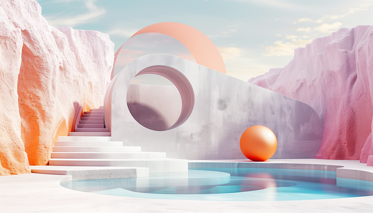 Surreal landscape with modern architecture, pastel cliffs, and an orange sphere by a blue pool under a soft blue sky.