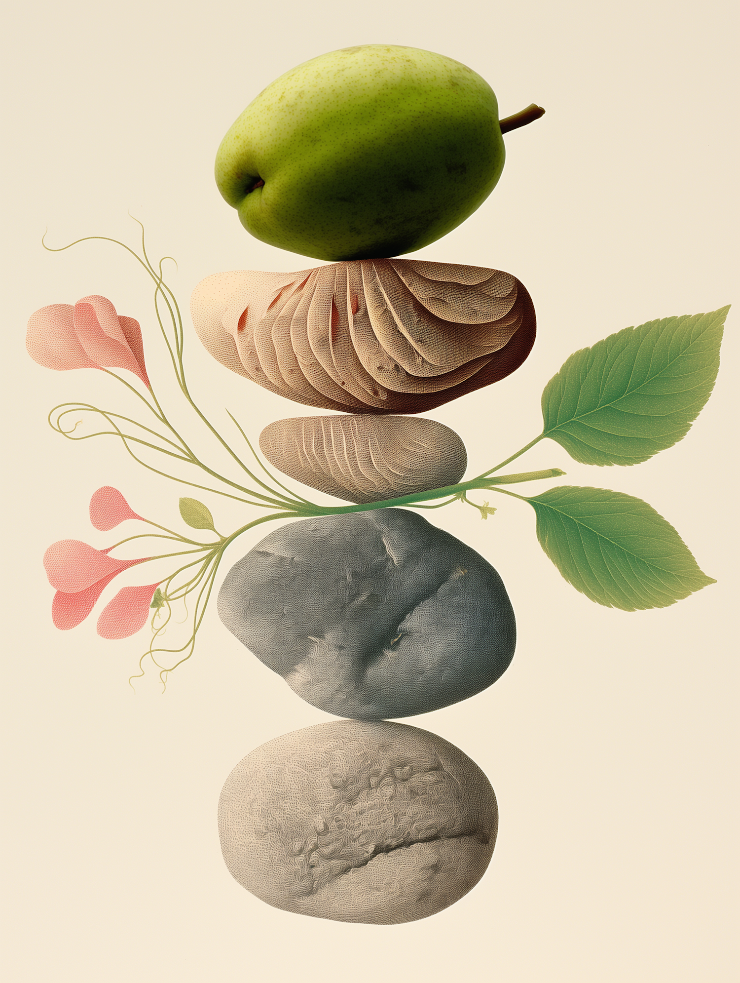 Surreal stack of a green pear, layered formations, pink flowers, and stones on a beige background. Nature's harmony in art.