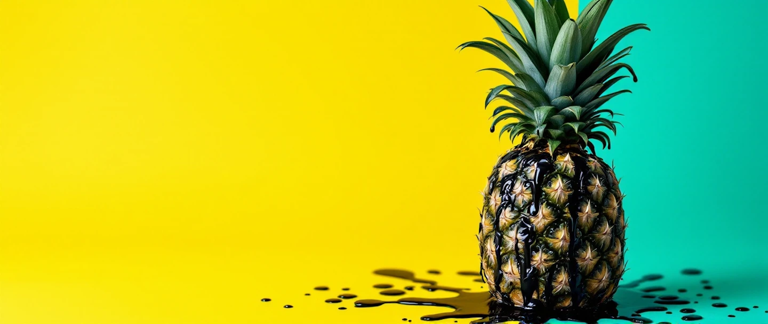 A pineapple with black liquid drips against a vibrant yellow and teal background, creating a striking visual contrast.