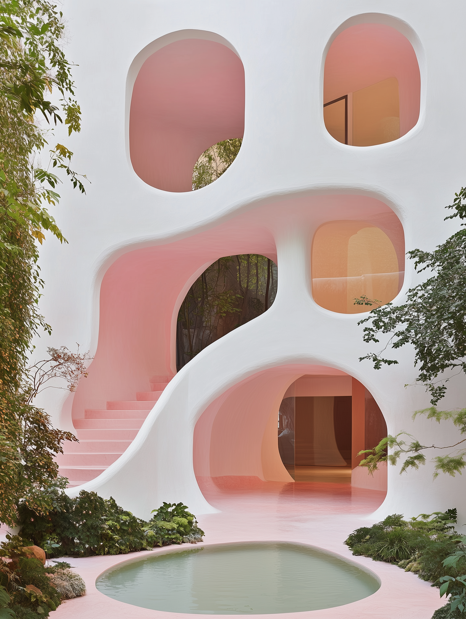 A dreamy white and pink building with organic shapes, lush greenery, and a serene pool, blending modern architecture with nature.