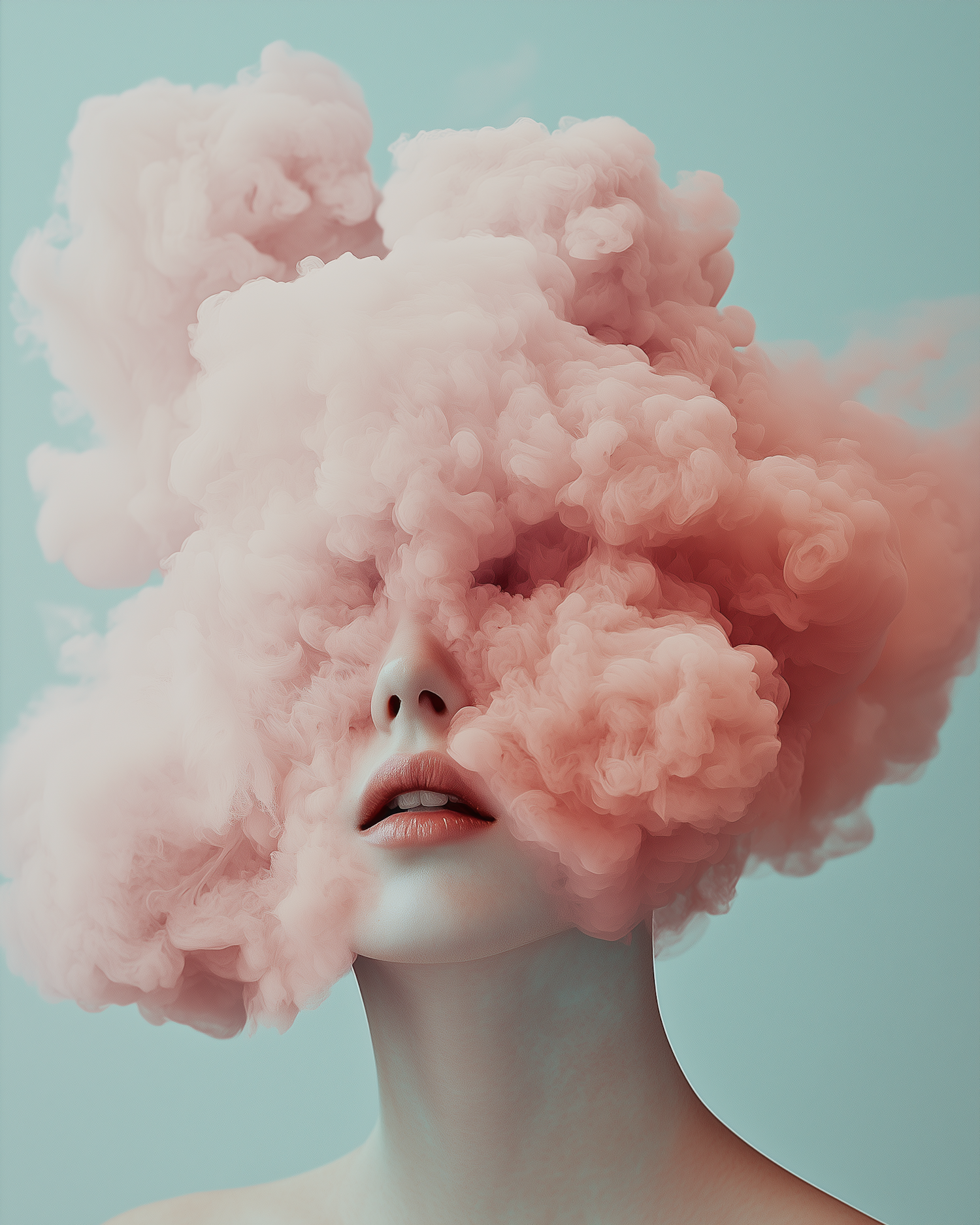 A surreal portrait of a face blending with pink clouds against a teal background, creating a dreamy and ethereal visual effect.