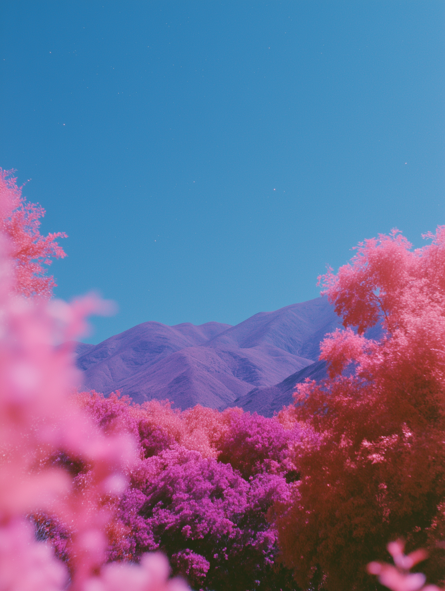 A surreal landscape with vibrant pink trees, purple mountains, and a vivid blue sky, creating a dreamlike and colorful scene.