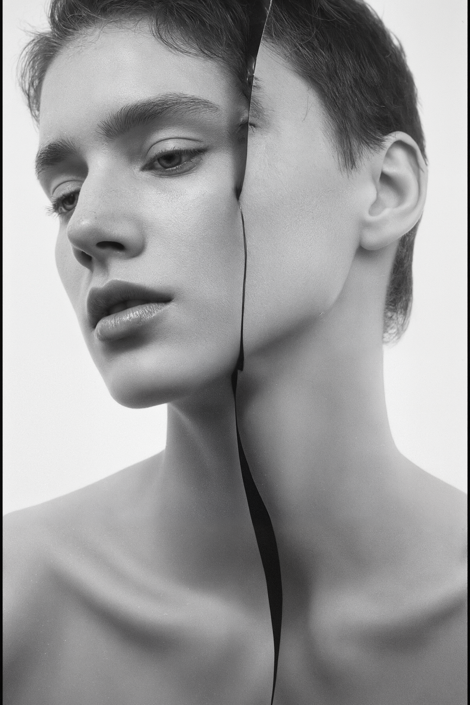 Black-and-white surreal portrait of a person with a fragmented face effect, short hair, and a neutral expression against a plain background.