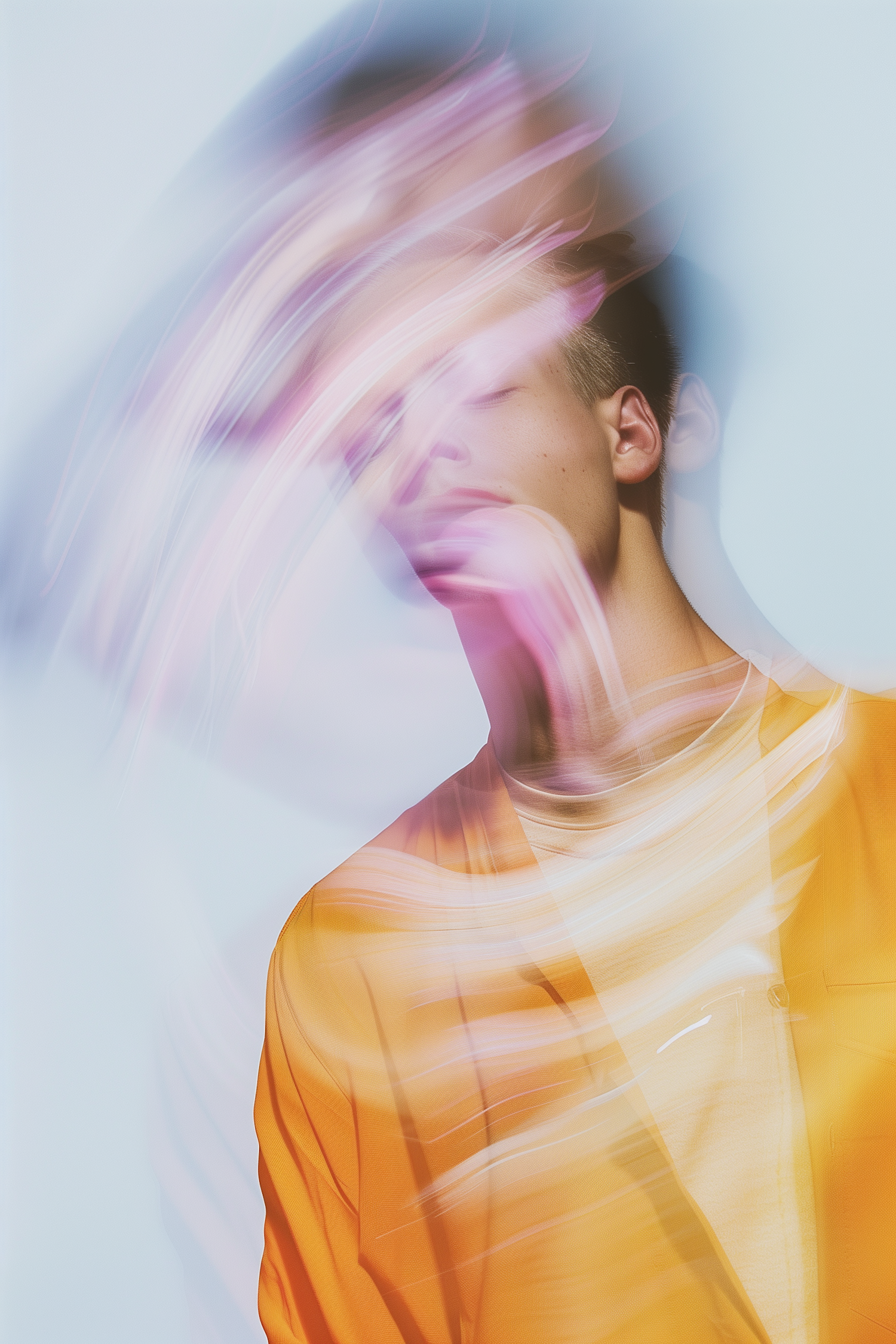 A surreal portrait of a person in an orange jacket with dynamic pink and yellow light streaks against a pale blue background.