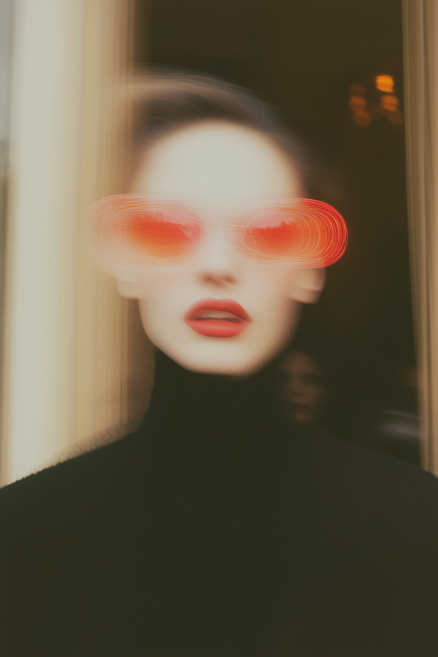 Surreal portrait of a person in glowing red sunglasses, red lips, and a black turtleneck, with a blurred, dreamlike aesthetic.