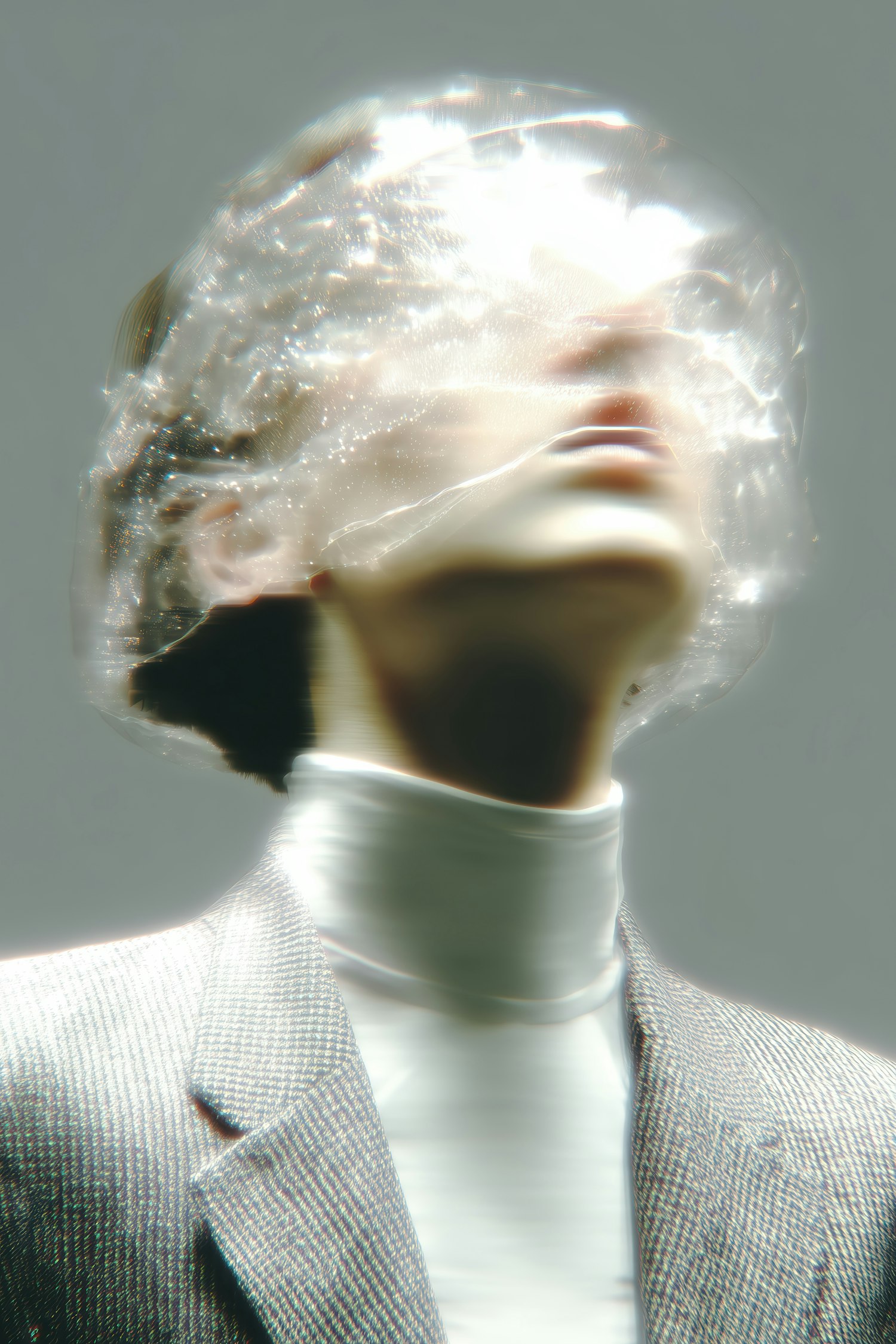 A surreal portrait of a person in a suit with their face obscured by reflective material, creating a dreamlike and abstract visual effect.