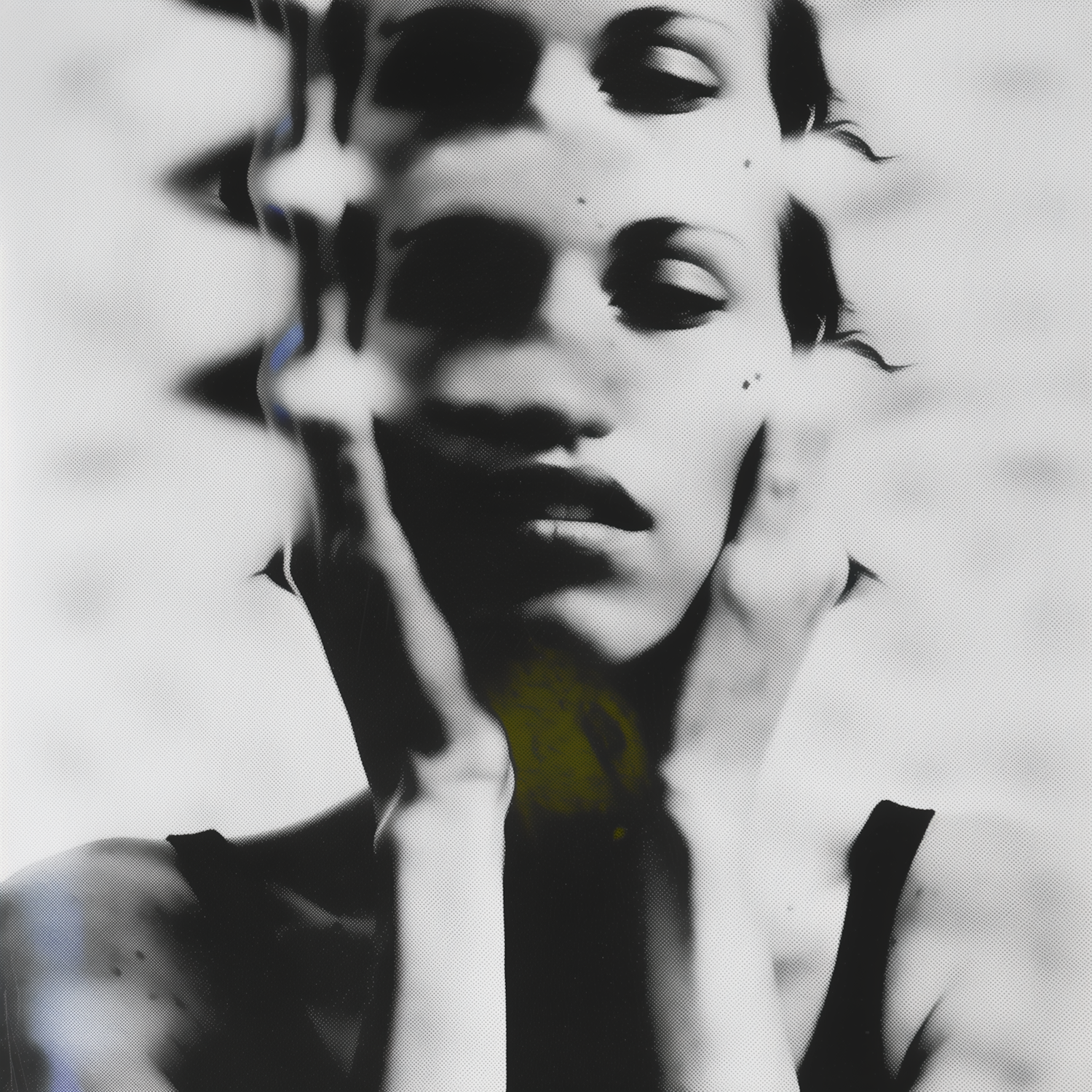 Surreal black-and-white portrait with distorted facial features and hands framing the face, creating an abstract, dreamlike effect.