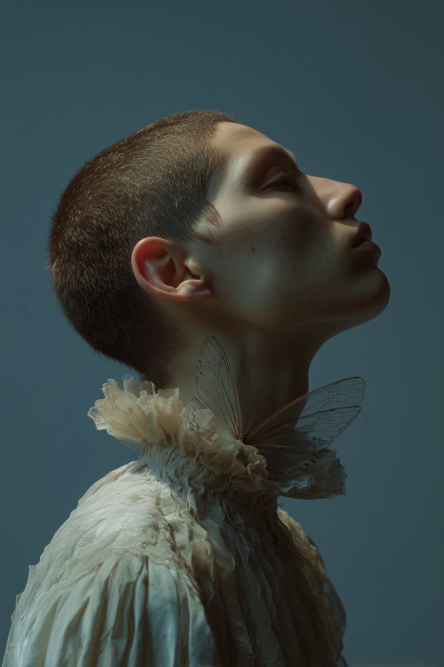 Profile of a person with a ruffled collar and delicate insect wing accessories, set against a serene blue background.