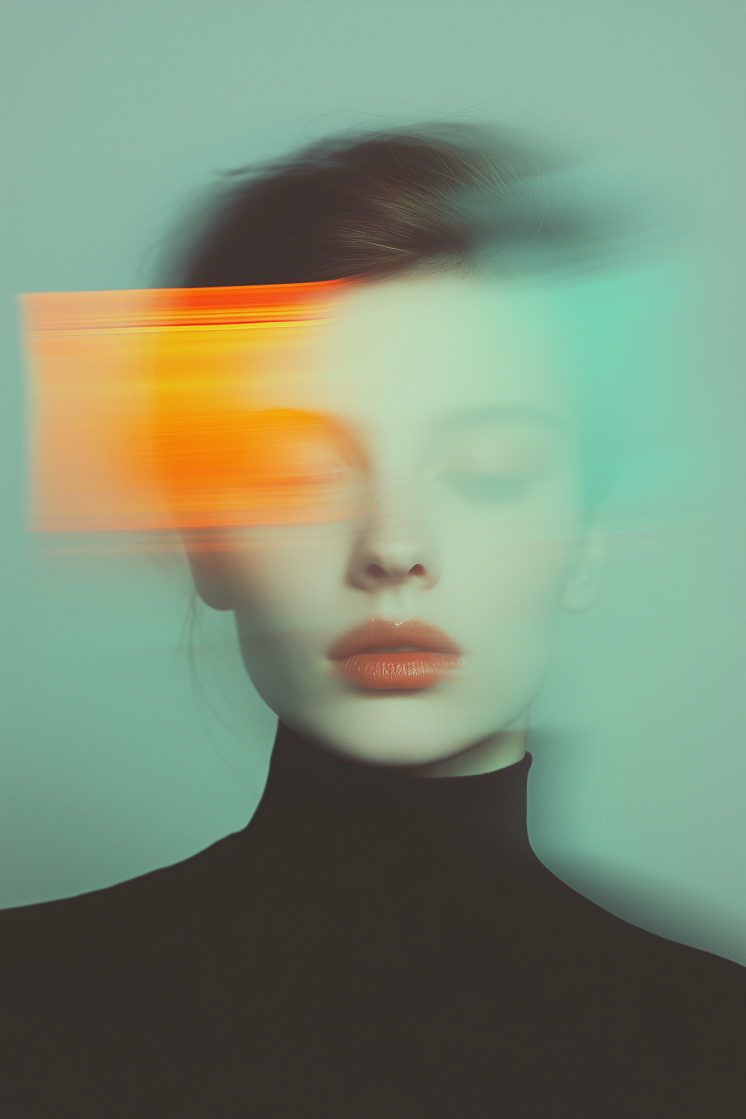 A surreal portrait of a woman with closed eyes, glossy red lips, and streaks of orange and teal light creating a dreamy effect.