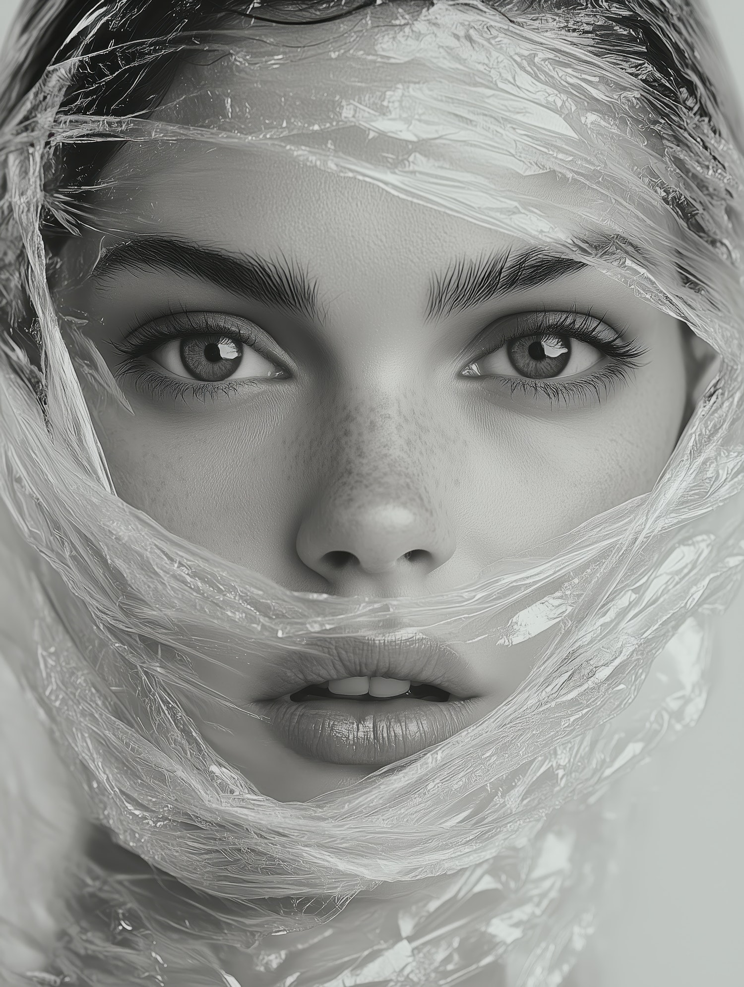 Close-up of a freckled woman with plastic wrap around her face, creating a surreal and artistic monochromatic portrait.