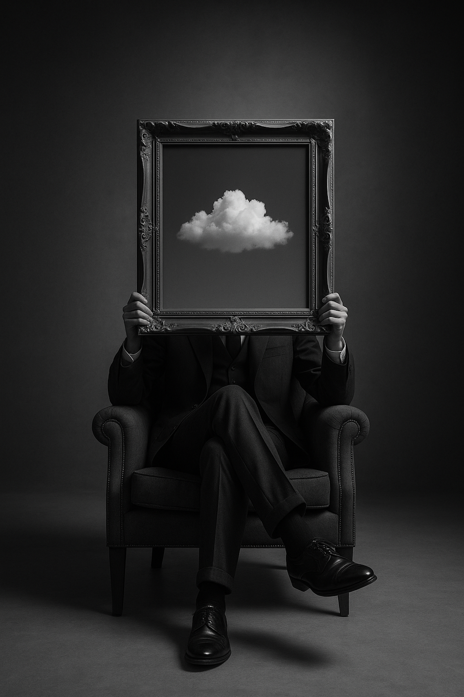 A surreal black-and-white image of a person holding a frame with a cloud, seated in a dark armchair, creating a mysterious atmosphere.