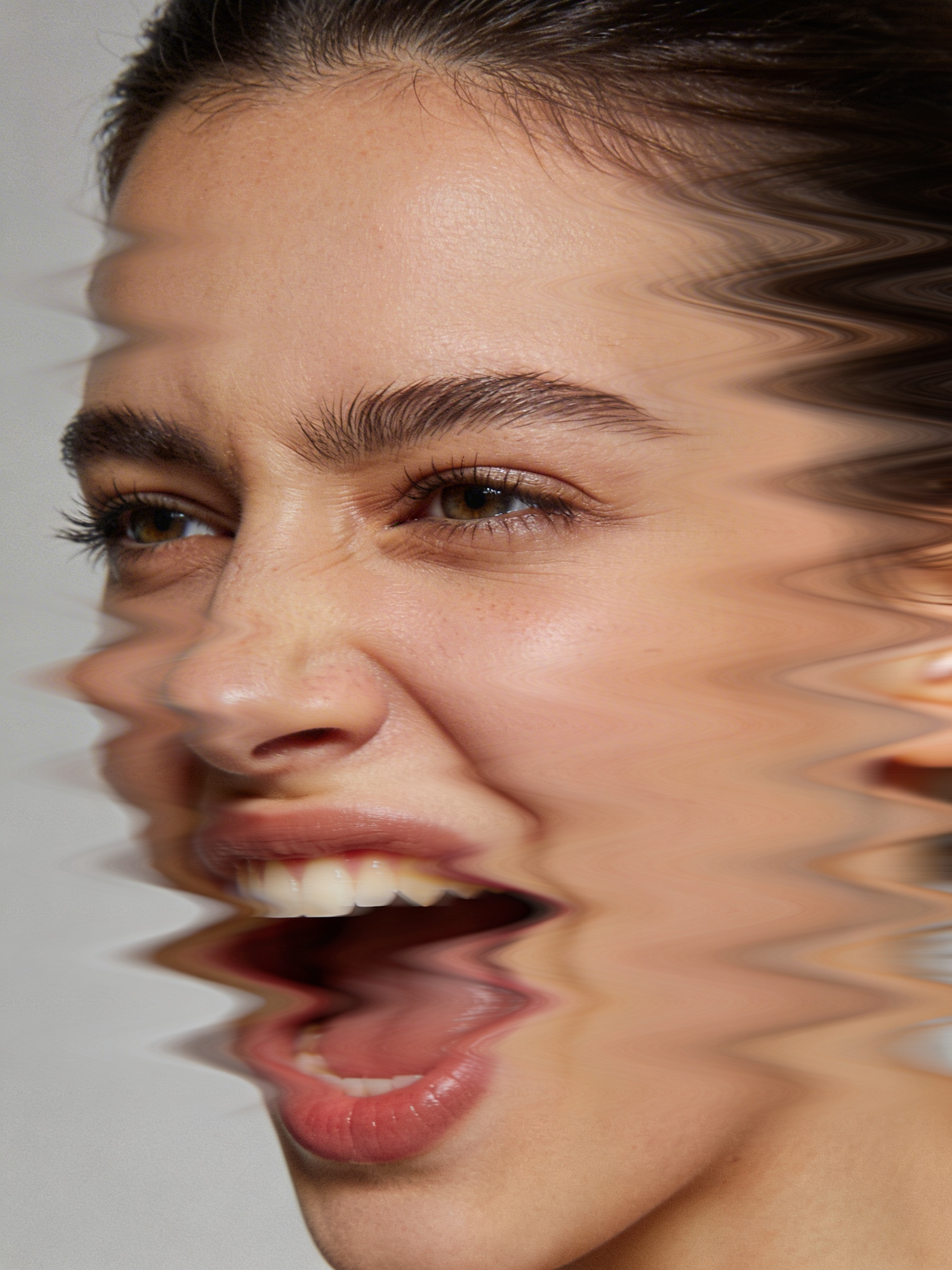 A close-up of a person's face with a wavy distortion effect, showcasing expressive features and a surreal artistic touch.