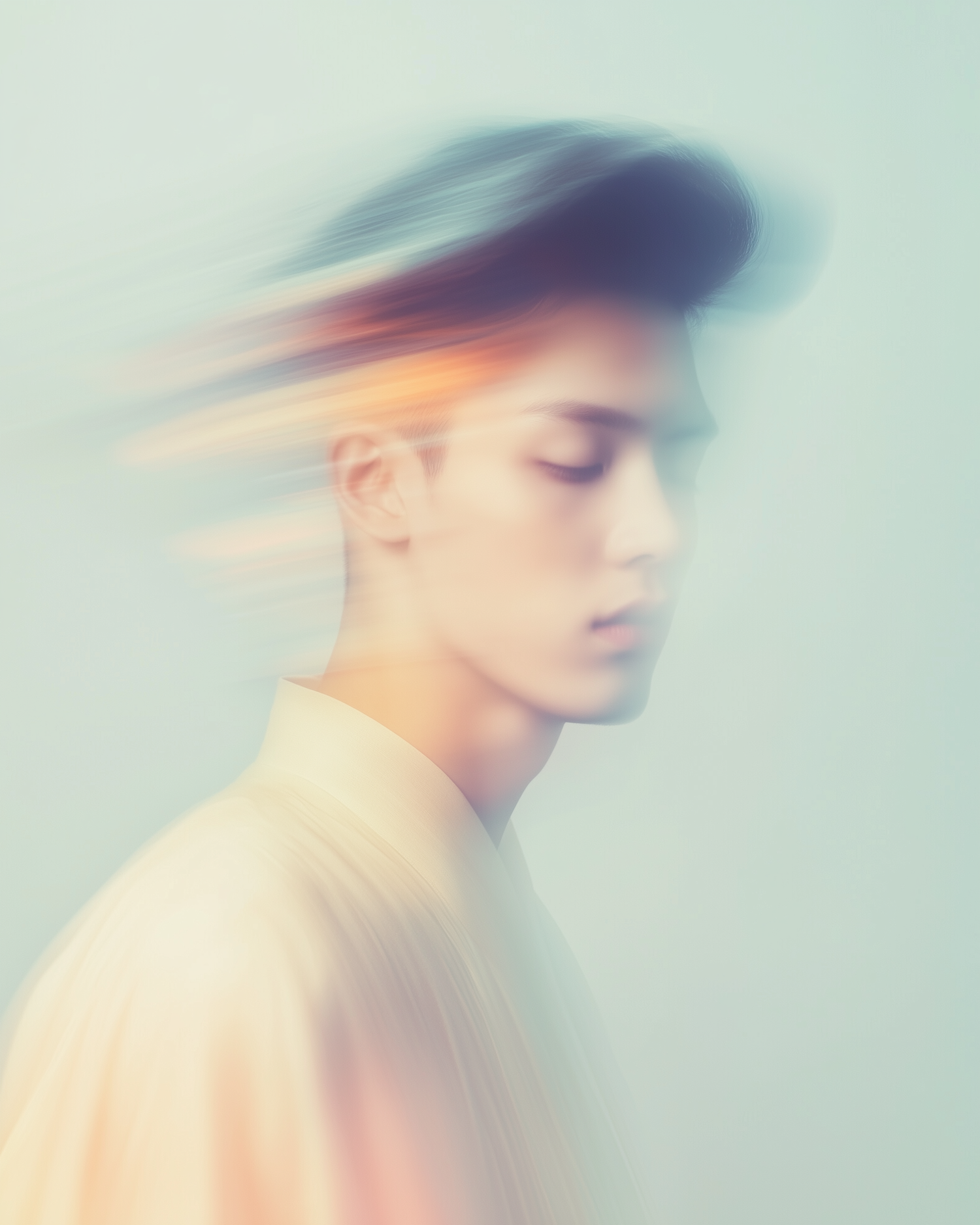Ethereal portrait of a man with motion blur effects, soft cream attire, and serene expression against a pale blue gradient background.