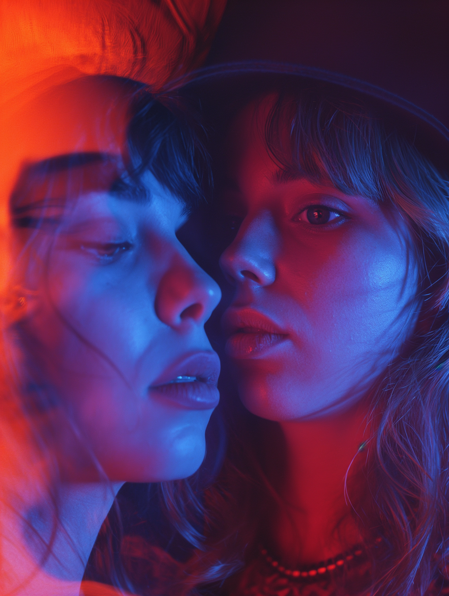 Artistic portrait of two women in dramatic red and blue lighting, creating a striking visual contrast.