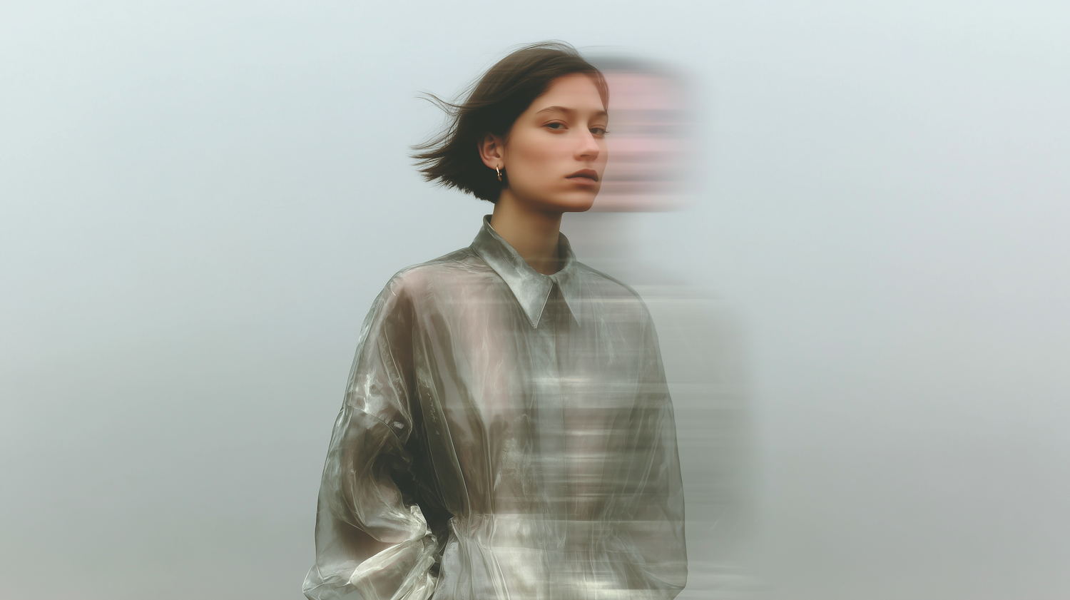 A surreal portrait of a woman in a metallic shirt with a blurred figure in the background, creating a dreamy, ethereal effect.