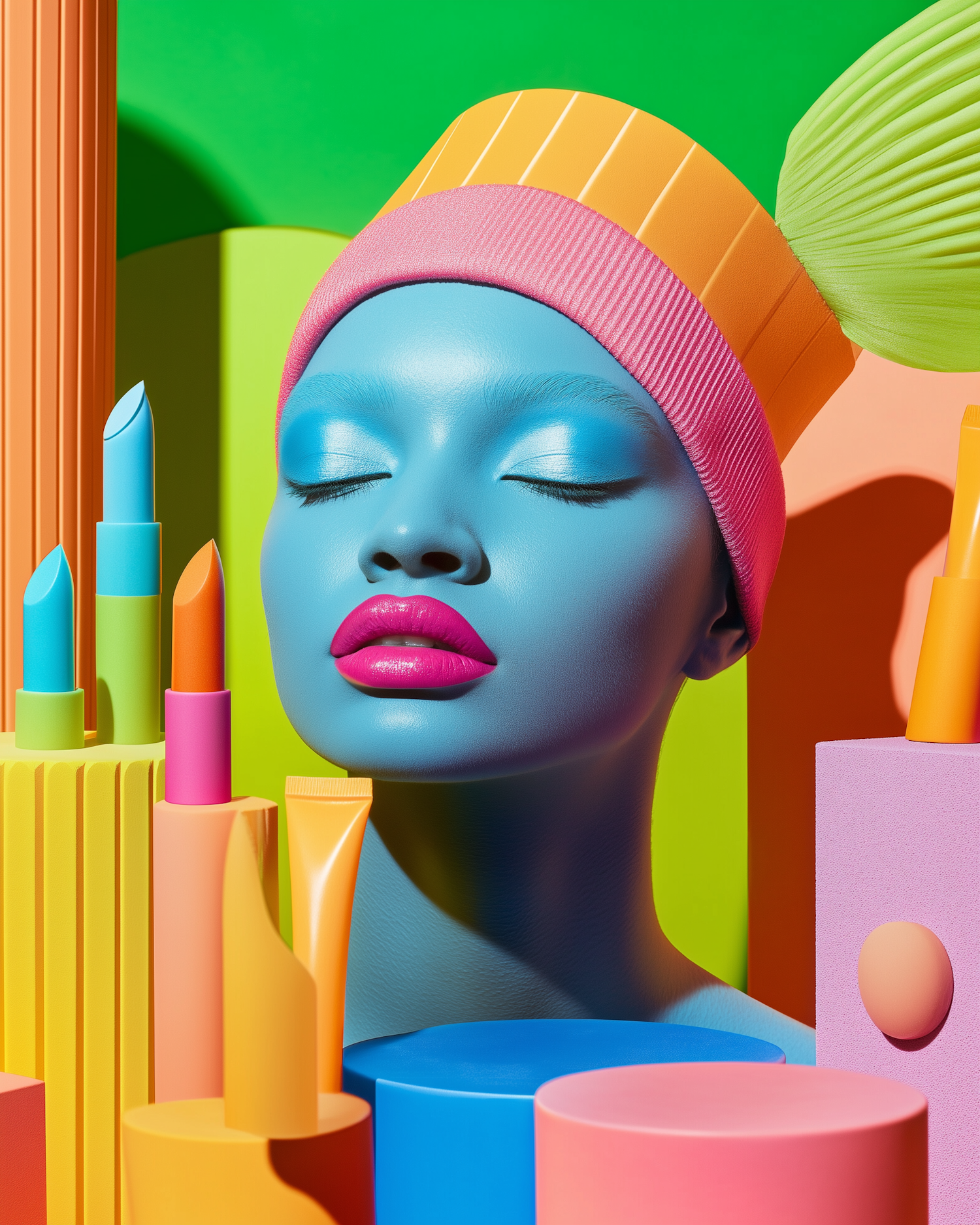 Surreal illustration of a blue-skinned person with vibrant makeup, surrounded by colorful geometric shapes and objects.
