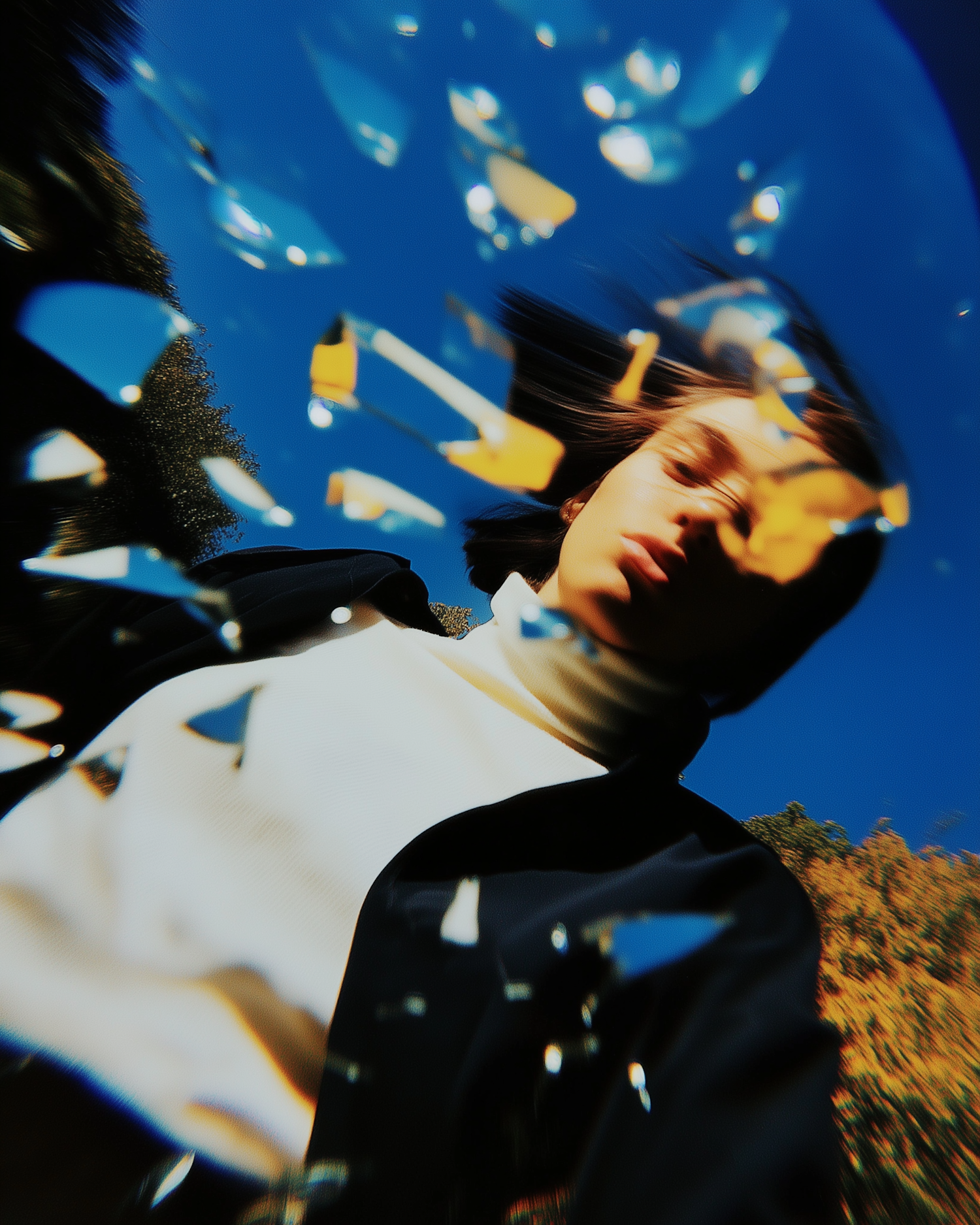Artistic shot of a person with reflective glass shards, a vivid blue sky, and autumn foliage creating a surreal, dreamlike vibe.