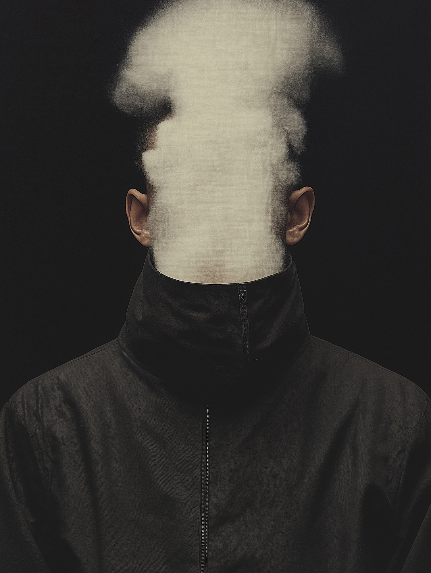 Surreal image of a person with a cloud of smoke obscuring their face, wearing a black jacket against a dark background.