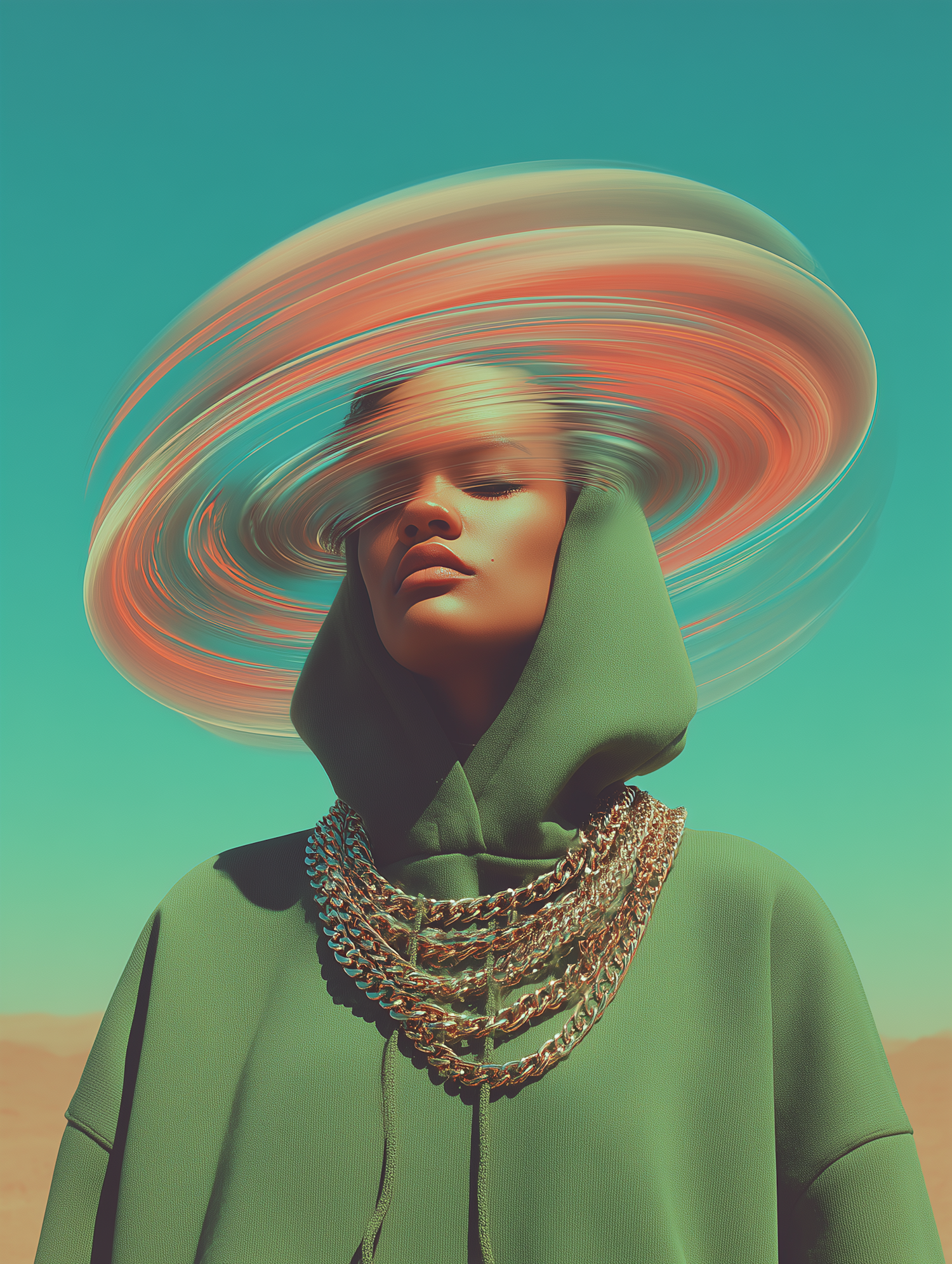 A surreal portrait of a person in a green hoodie with gold chains, featuring a swirling orange halo against a vibrant blue sky.