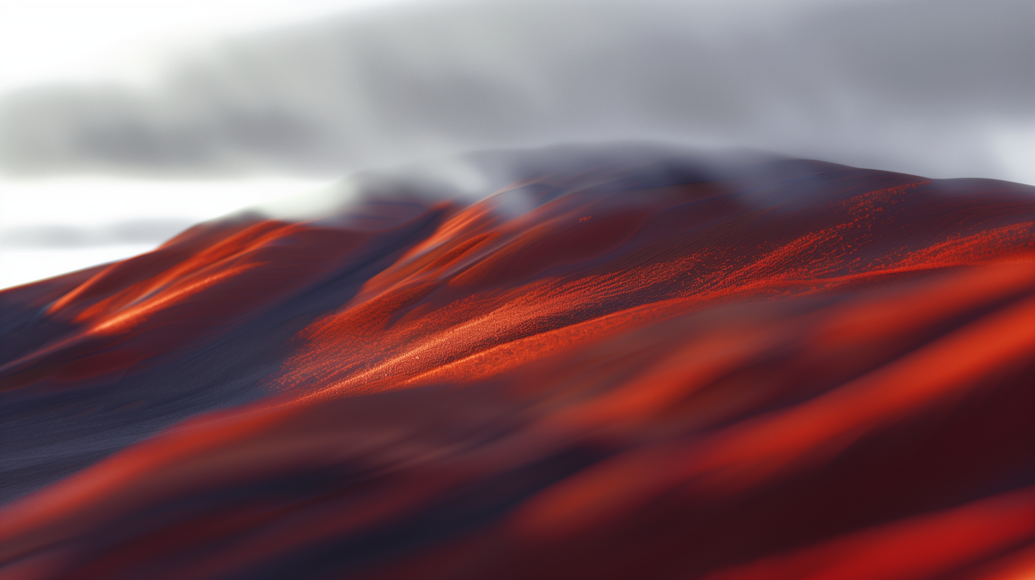 A surreal landscape of red hills under a misty sky, showcasing vibrant colors and smooth textures in a dreamlike atmosphere.