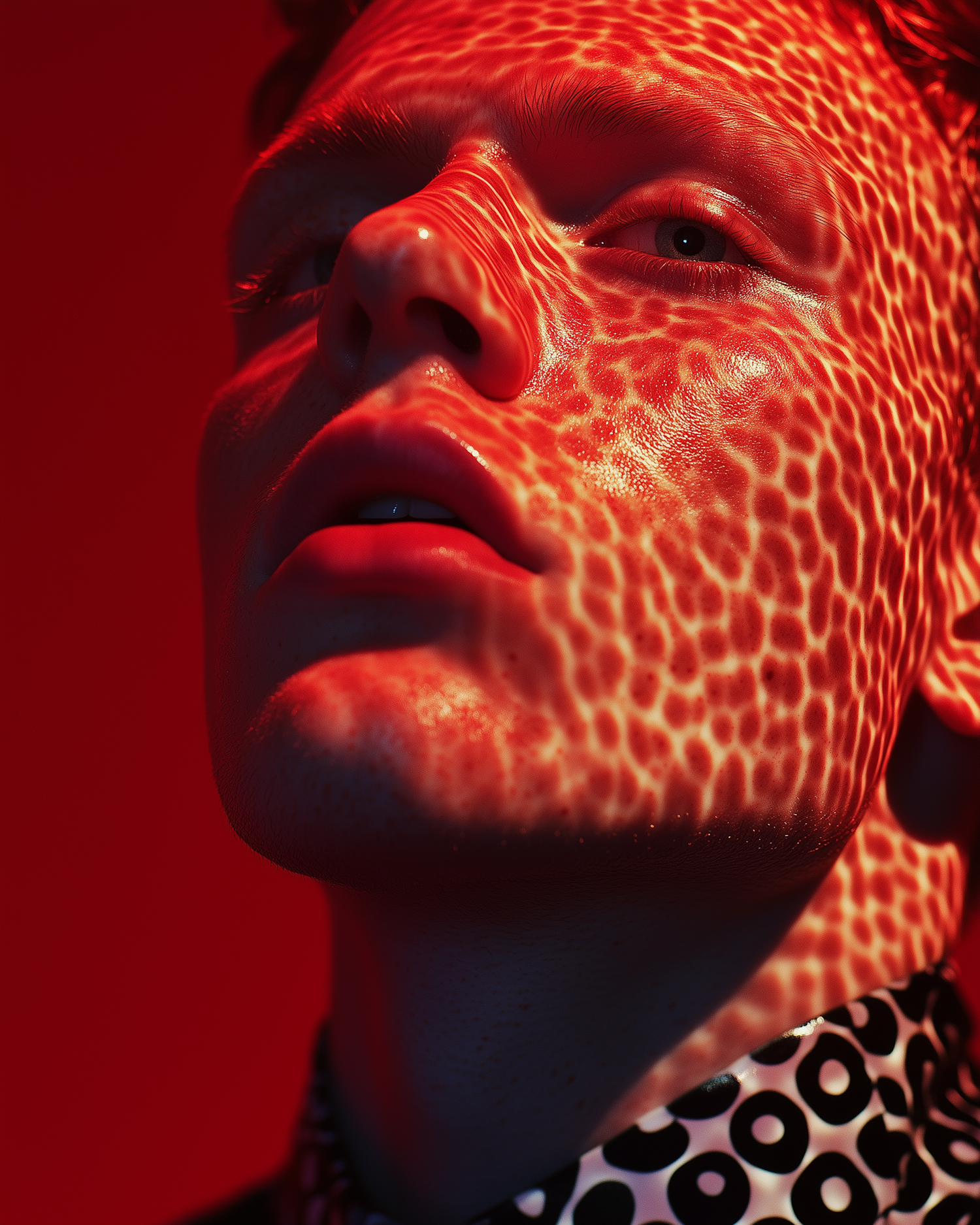 Close-up of a person in red lighting with textured light patterns on their face, wearing a black and white patterned shirt.