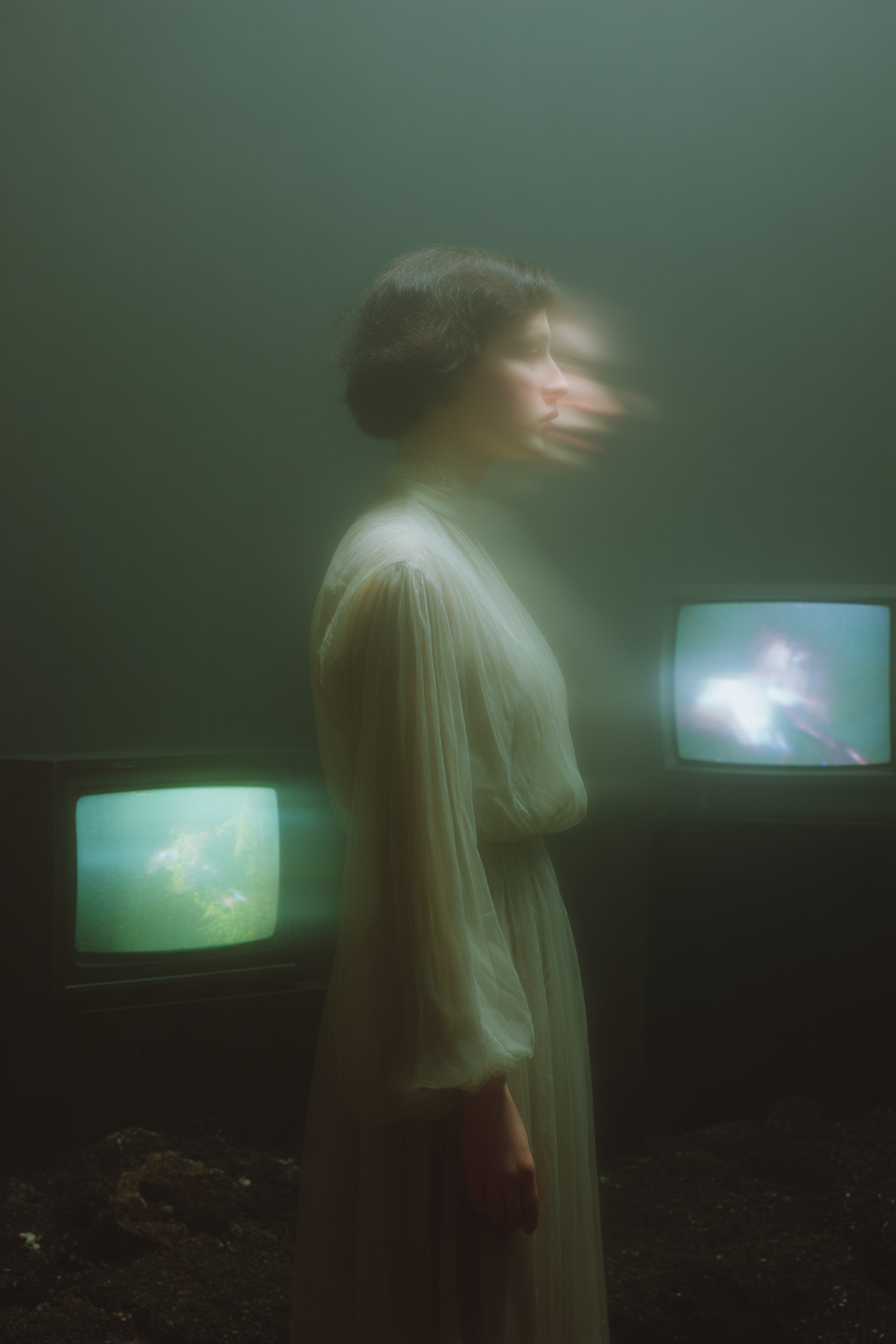 A surreal portrait featuring a person with blurred contours, standing amidst glowing vintage televisions in a dim, ethereal setting.