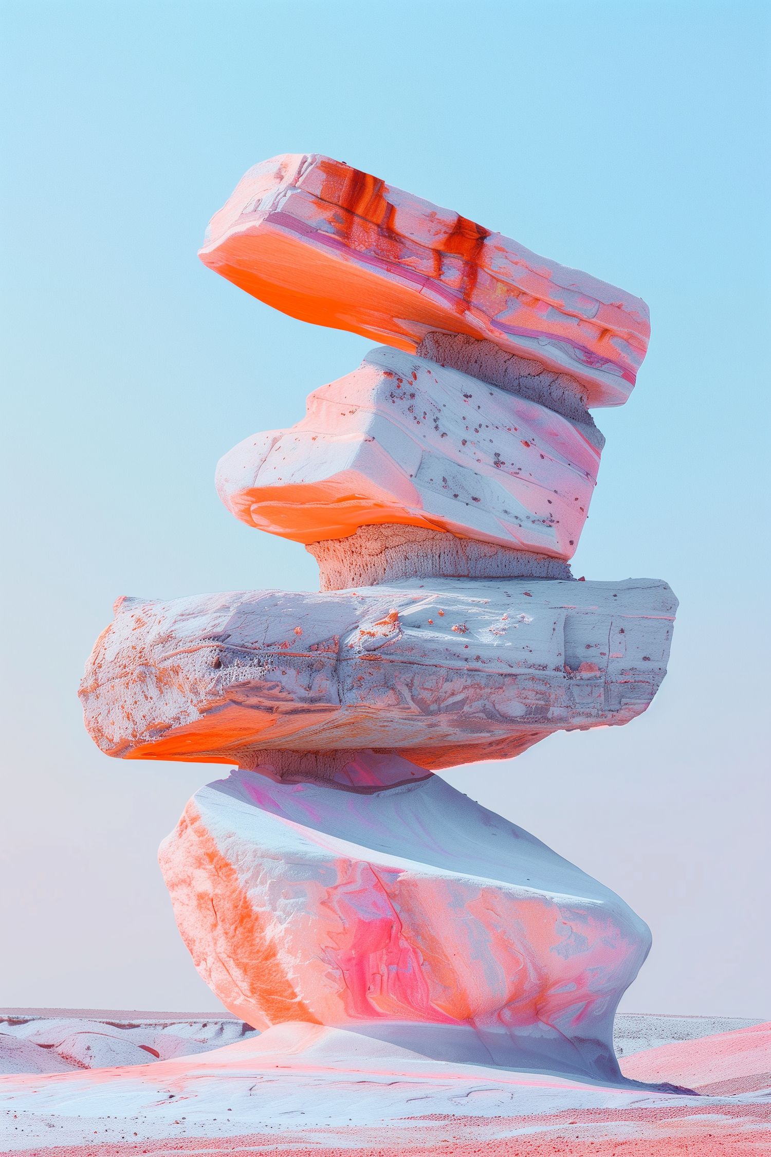 Surreal pastel rock formation against a clear blue sky, featuring smooth textures and vibrant pink, orange, and white hues.