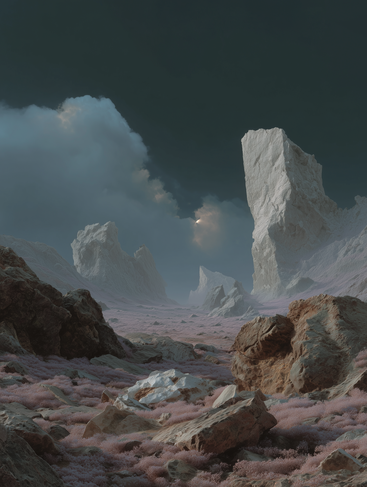 Surreal rocky landscape with pink vegetation under a dark, cloudy sky, illuminated by a faint moonlight. A mysterious and ethereal scene.