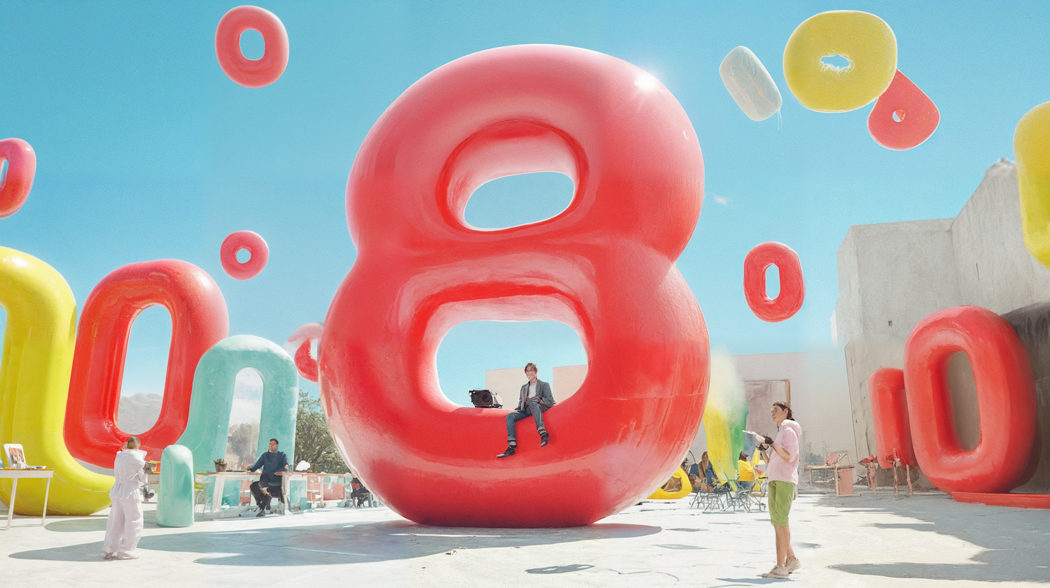 Surreal outdoor scene with giant colorful numbers and people interacting in a whimsical setting under a clear blue sky.