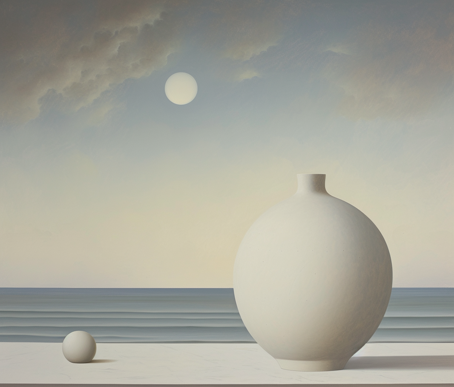 Minimalist scene with a large white vase, small sphere, calm ocean, and serene sky with sun or moon.