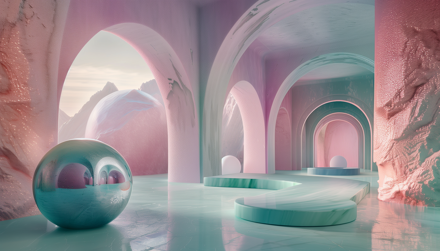 Surreal pastel arches and reflective sphere create a dreamlike scene with soft light and distant mountains in the background.